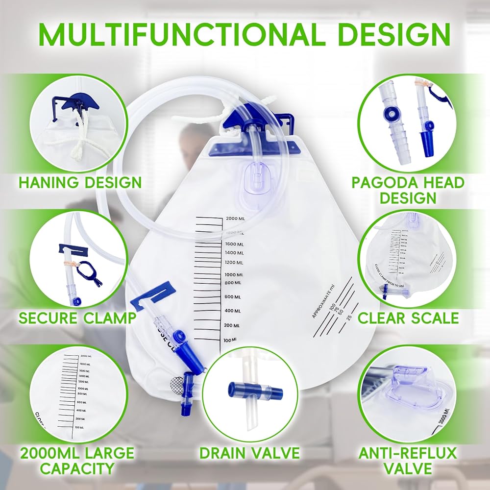 [2000ml Large Capacity:]The 2000ml anti-reflux urinary drainage bag offers a large capacity,reducing the need for frequent changes, making it ideal for bedridden elderly,enhancing their quality of life