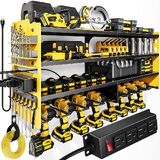 Large Power Tool Organizer Wall Mount with Charging Station,4 Layer Heavy Duty Metal Tool Storage Rack Loads 600lbs with 8 Cordless Drill Holder,Battery Utility Rack Loads with 4 Power Strip