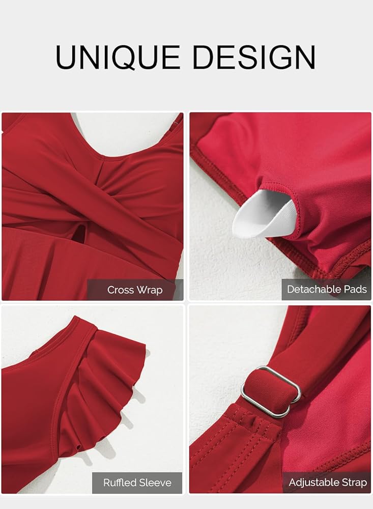 Wrap V Neck Swimsuit: The v neck and cross wrap detail enhances the bust, ruffled sleeves make it look slimmer and built in detachable soft padded, exquisite details creates a flattering silhouette