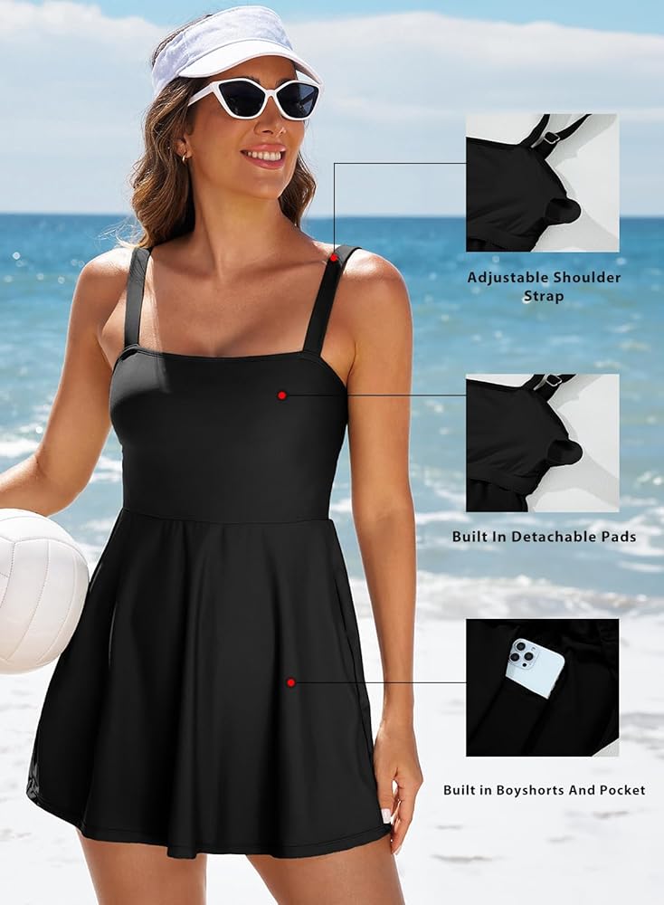 Built in Bottom with Pockets: Modest one piece swim dress is connected to shorts bottom with pockets, making it easy to carry your cards and other items, freeing up your hands