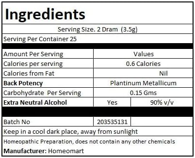 Ingredients: Platinum Metallicum Homeopathic Dilution of desired potency, Sucrose. Packed in sterile 2-dram glass vials, each containing more than 220 pellets. Prepared by traditional hand succussion