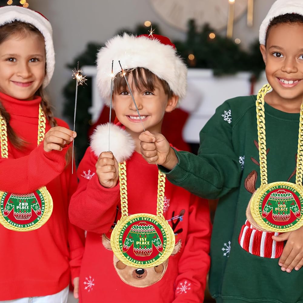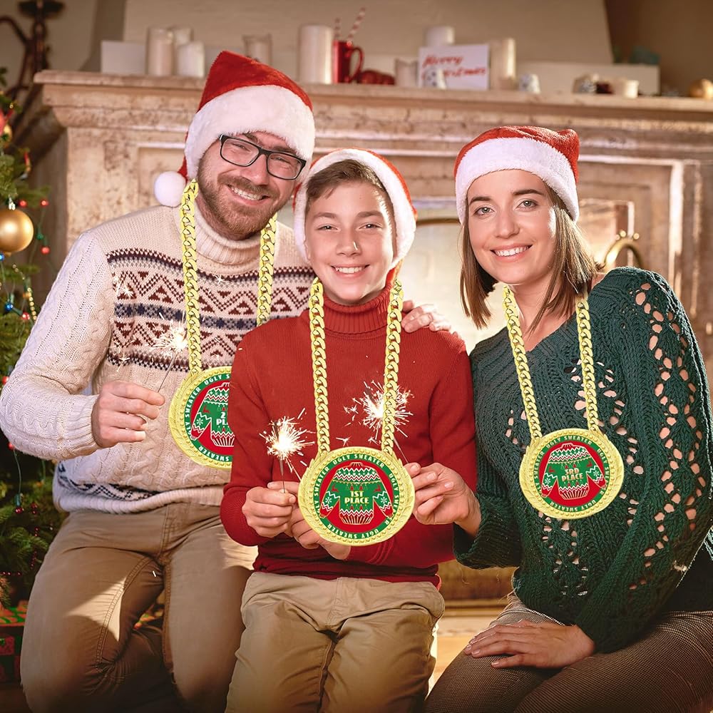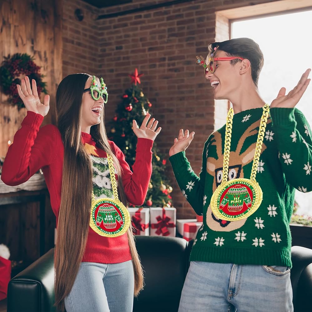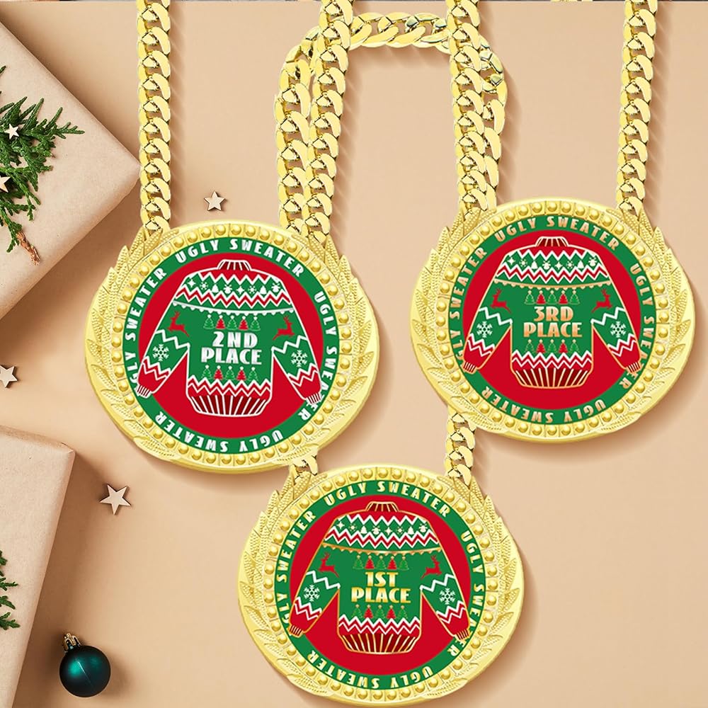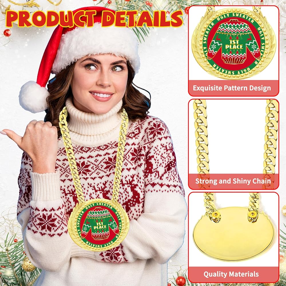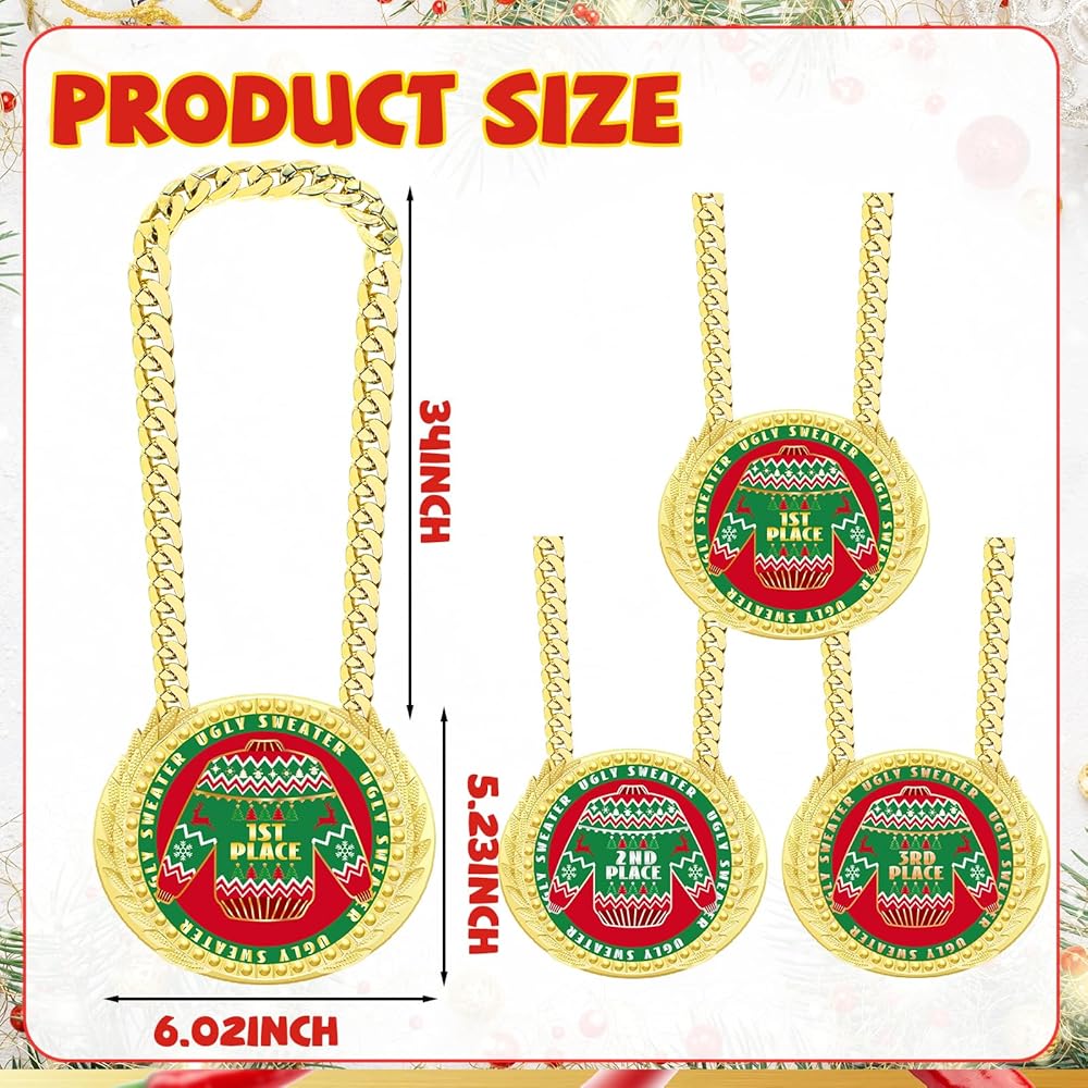 Our 6 Inch Christmas ugly sweater trophy award medals, jumbo chain medals, huge ugly Christmas sweaters prizes, big ugly Christmas ornaments, large Christmas party decorations, ugly sweater party supplies are suitable for Christmas ugly sweater party, ugly sweater contest, ugliest sweater competition and more.