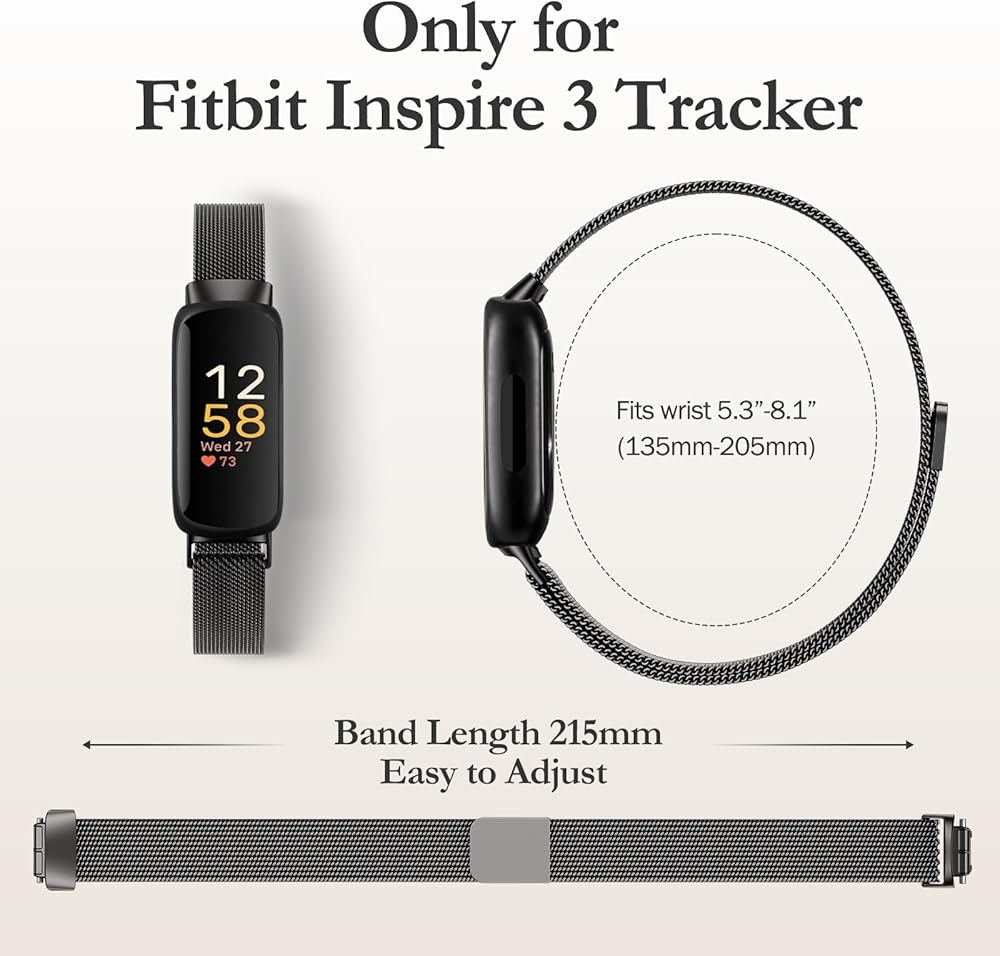 Compatible Model: JKD Soft Mesh Loop Stainless Steel Metal Band Perfectly Compatible with Fitbit Inspire 3 Fitness Tracker. [Not for Fitbit Inspire 2/Fitbit Inspire/Fitbit Inspire HR] It can fit for a 5.3"-8.1" wrist (135mm-205mm)