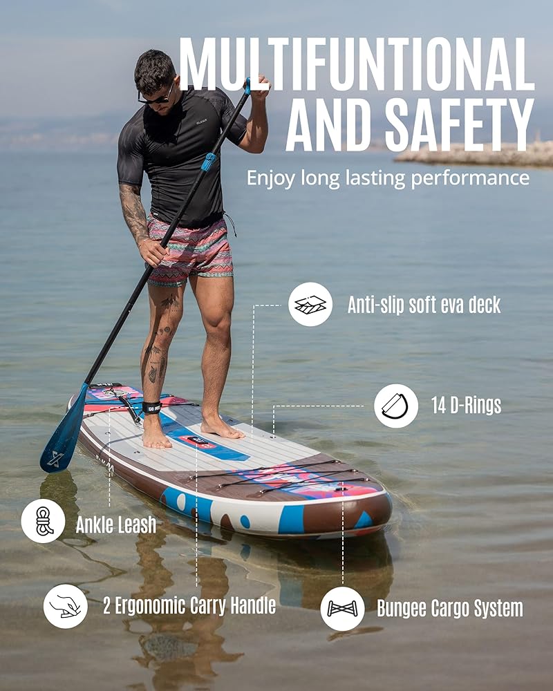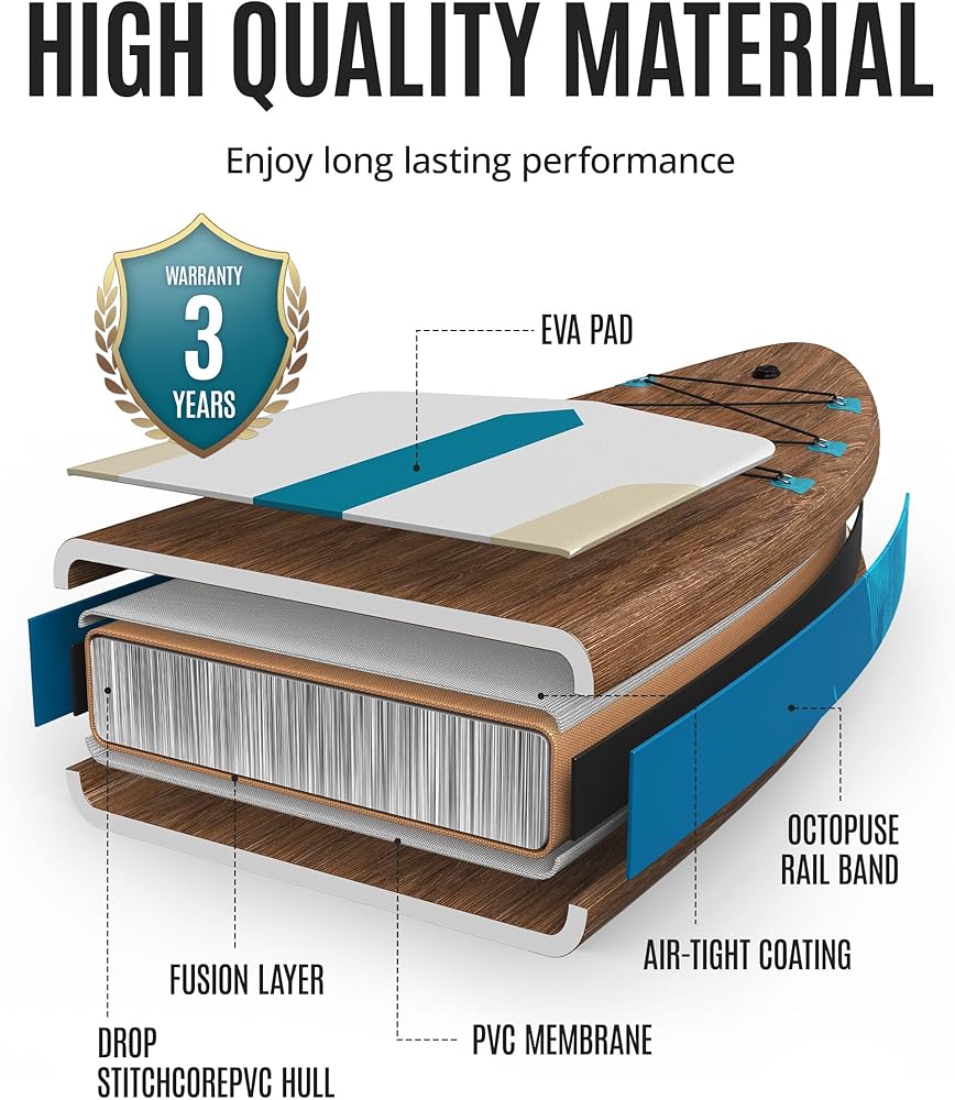 【𝗦𝘂𝗽𝗲𝗿 𝗗𝘂𝗿𝗮𝗯𝗹𝗲 𝗣𝗩𝗖】The paddle board adopts PVC and drop-stitch construction, which allow the surfboard withstand a lot of pressure 𝘄𝗶𝘁𝗵𝗼𝘂𝘁 𝗱𝗲𝗳𝗼𝗿𝗺𝗶𝗻𝗴 𝗼𝗿 𝗯𝘂𝗿𝘀𝘁𝗶𝗻𝗴. And the 𝗘𝗩𝗔 𝗵𝗮𝘀 𝗴𝗼𝗼𝗱 𝗳𝗿𝗶𝗰𝘁𝗶𝗼𝗻, which will prevent you from sliding. It's sturdy and safe for long time use.