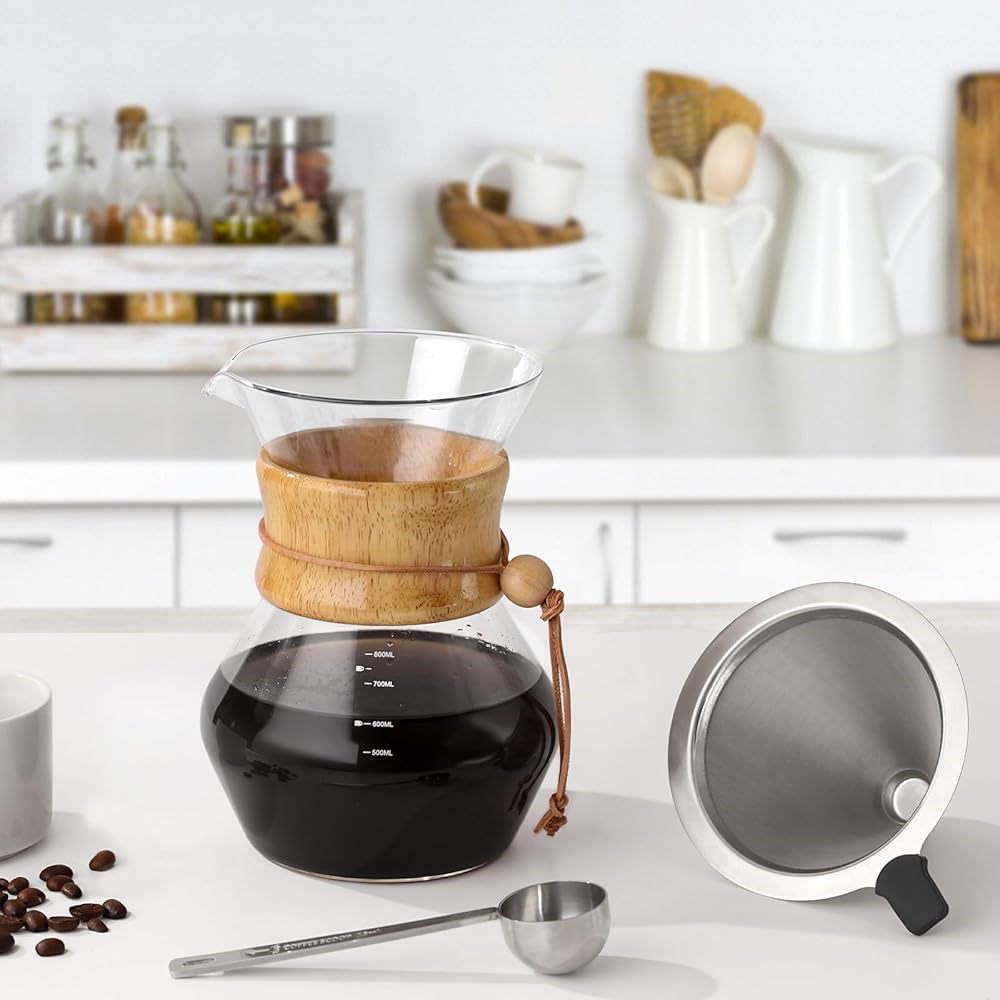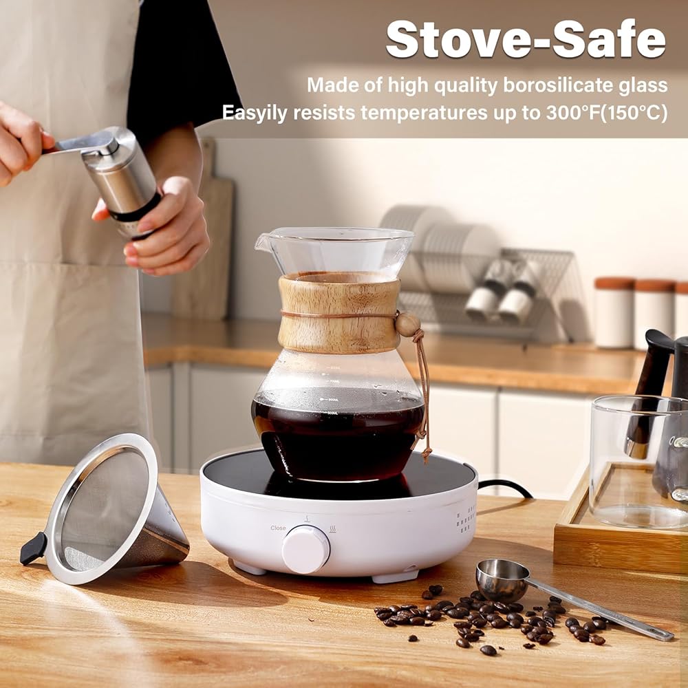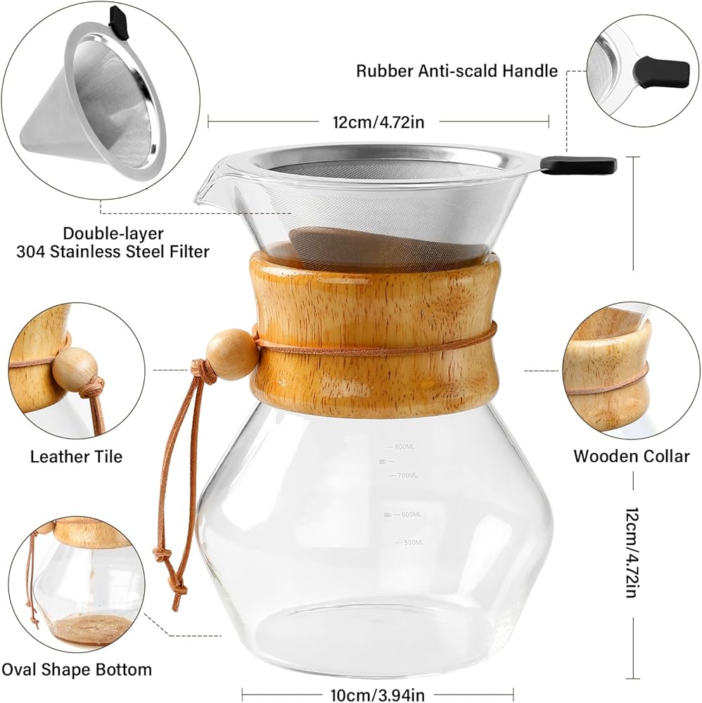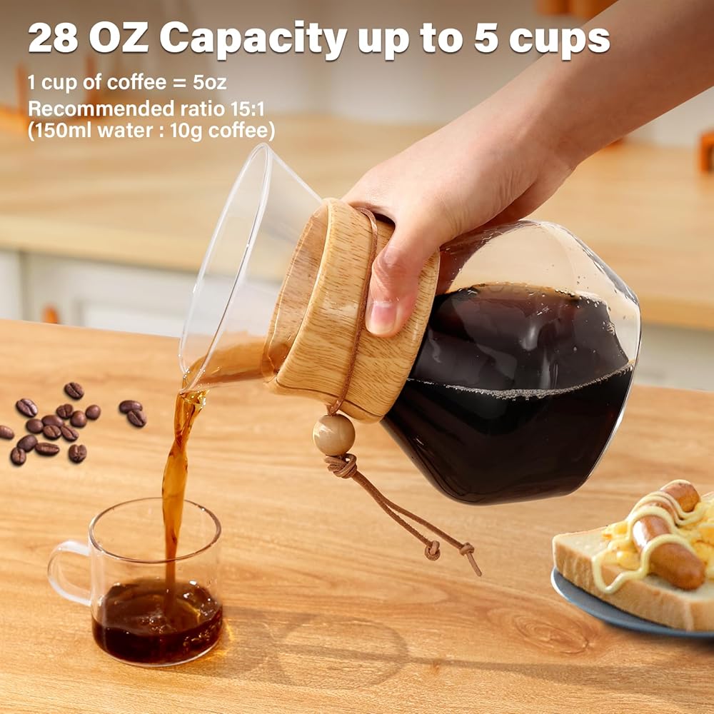 Stove and Diswasher Safe - COPOTEA pour over coffee maker is made of high-quality borosilicate glass, which is lead free, and does not contain any heavy metal or toxins. The material is heat-resistant and durable for everyday use. The pour over coffee pot and filter are dishwasher safe, while the wooden sleeve and sleeve tie can be cleaned with a few swipes of a cloth.
