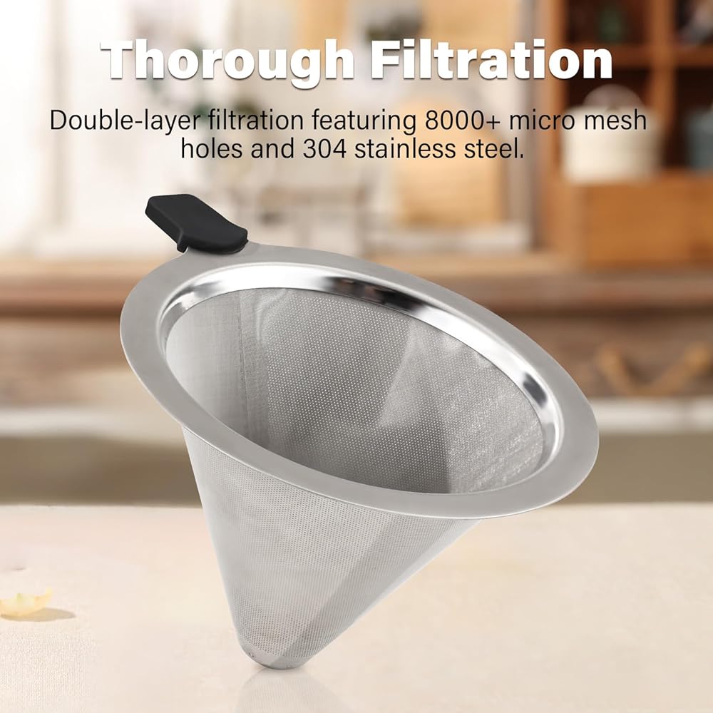 Double-layer filter: Double-layer 304 stainless steel allows the fine oil in the coffee powder to blend into the coffee, creating a richer, fuller flavor, and does not produce coffee powder deposits, no filter paper required, reusable.