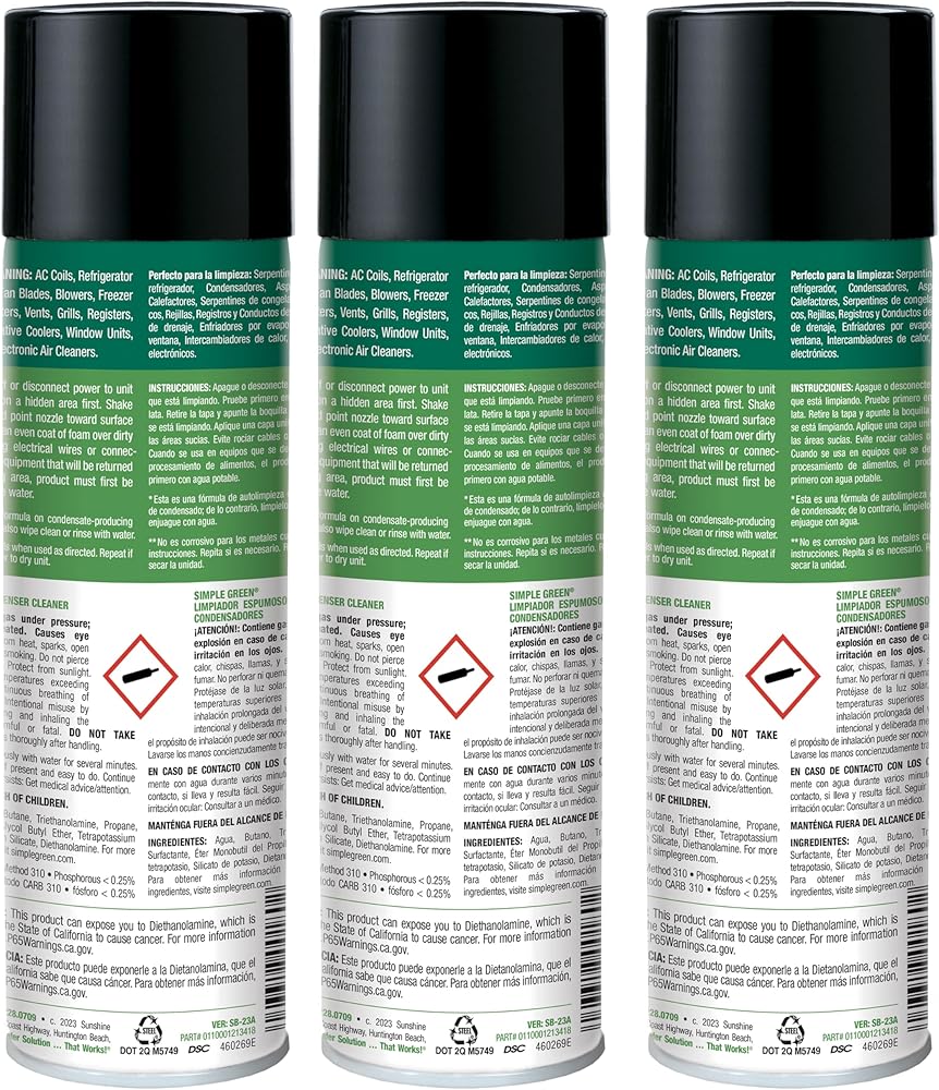 Simple Green Foaming Coil Cleaner powers away tough grease and grime. The professional-strength formula quickly penetrates to remove dirt and grease that can cause clogs, impede heat transfer, or prevent optimum equipment performance. When sprayed under pressure, the non-caustic and non-flammable foam clings to even the most hard-to-reach areas. It's self-rinsing on condensate-producing coils, making application quick and simple. This formula contains no added color or scent and is NSF registered C1 and K5, making it ideal for use in food processing facilities.