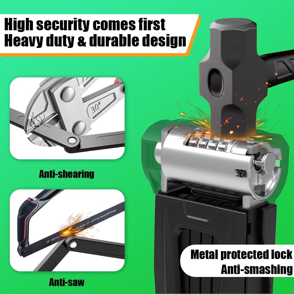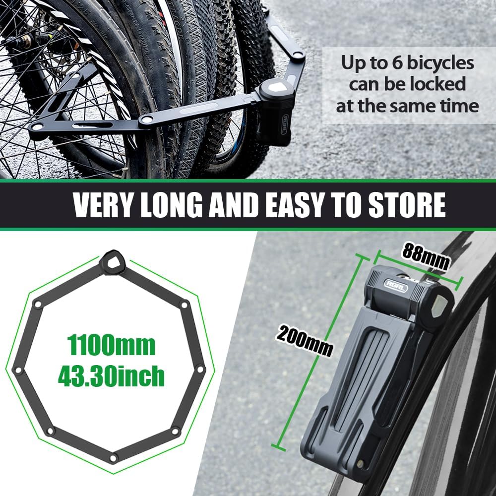 【User-friendly】: This bicycle chain lock adopts a 4-digit resettable combination, eliminates the need for keys, providing a more convenient and time-saving alternative solution. The bicycle lock is made of 8 sturdy hardened steel plates, 110cm long (3.6ft), can easily lock 6-8 bicycles at the same time