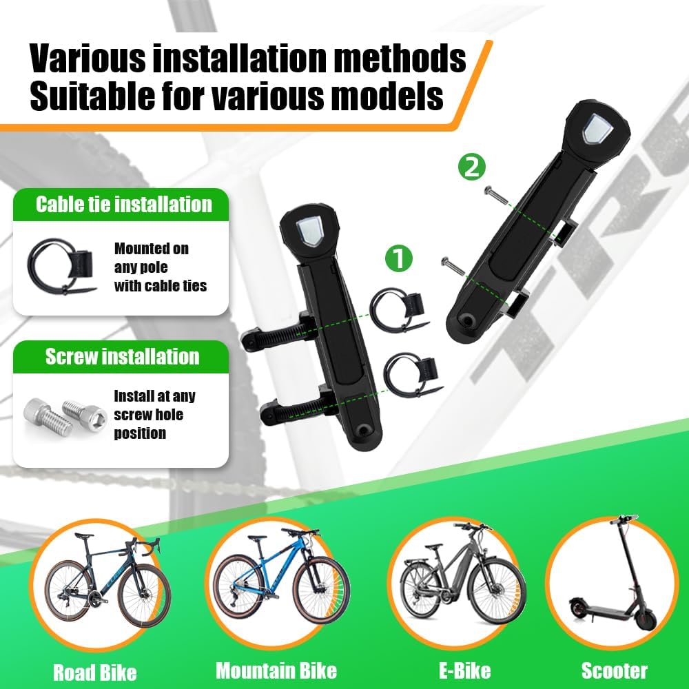 【Innovative Installation】: The folding lock allows you to mount the bracket with screws to the existing holes of the bottle holder on your bike, or install it anywhere with mounting straps. After fixation, the bike no longer creaks even on bumpy roads. It adpots innovative lock holder, you can take out the lock from left/right/up, very user-friendly