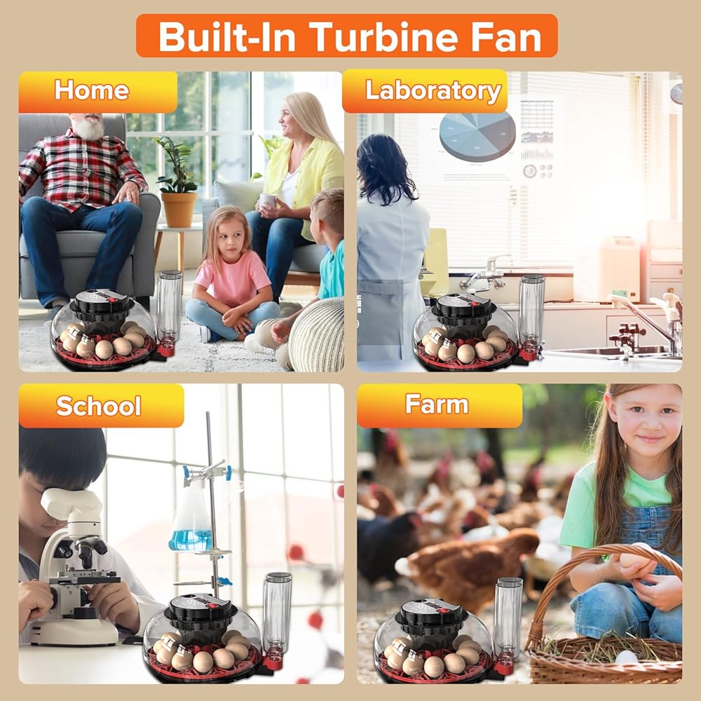 🐣【Advanced 360° Airflow Circulation】Our innovative airflow system guarantees a consistent and uniform distribution of temperature and humidity during the entire incubation process, establishing an ideal environment for your eggs to thrive. It eliminates any potential hotspots or cold spots that could endanger the embryos.