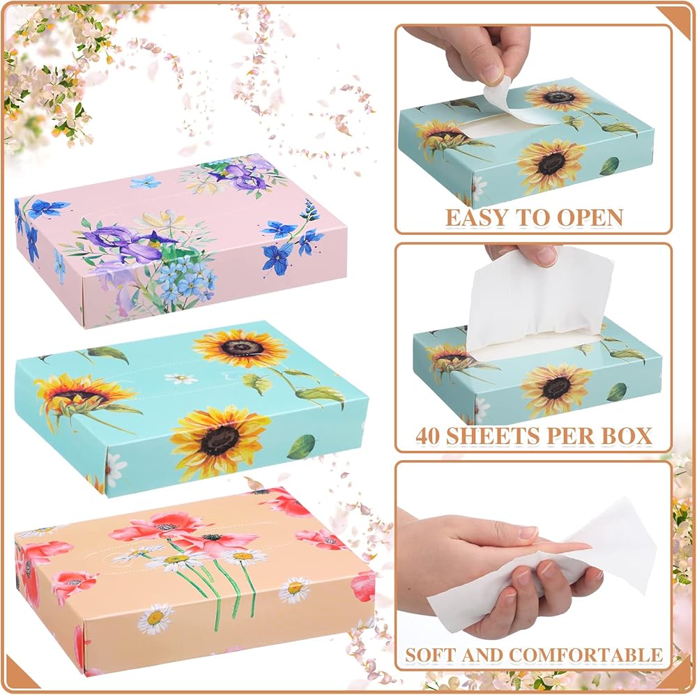 Detail Size: the size of the tissue box is about 5.91 x 4.33 x 1.18 inches/ 15 x 11 x 3 cm, and the size of the facial tissues is about 7.09 x 5.12 inches/ 18 x 13 cm; You will receive 24 boxes of facial tissues, and there are 40 sheets in each box, 960 sheets in total, enough for your daily use
