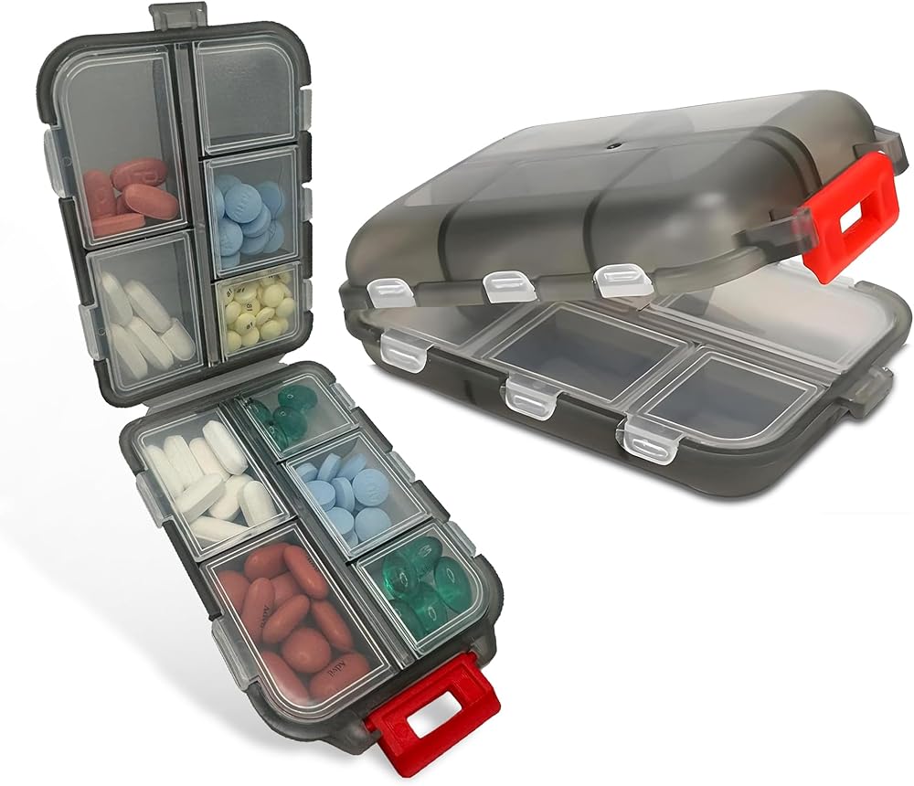 • Efficient 10-Compartment Storage: Our pill organizer small is optimally split into 10 compartments of different sizes that adapt to all your storage needs! Organize, store or sort your tablets, capsules, supplements and medicine more effectively!