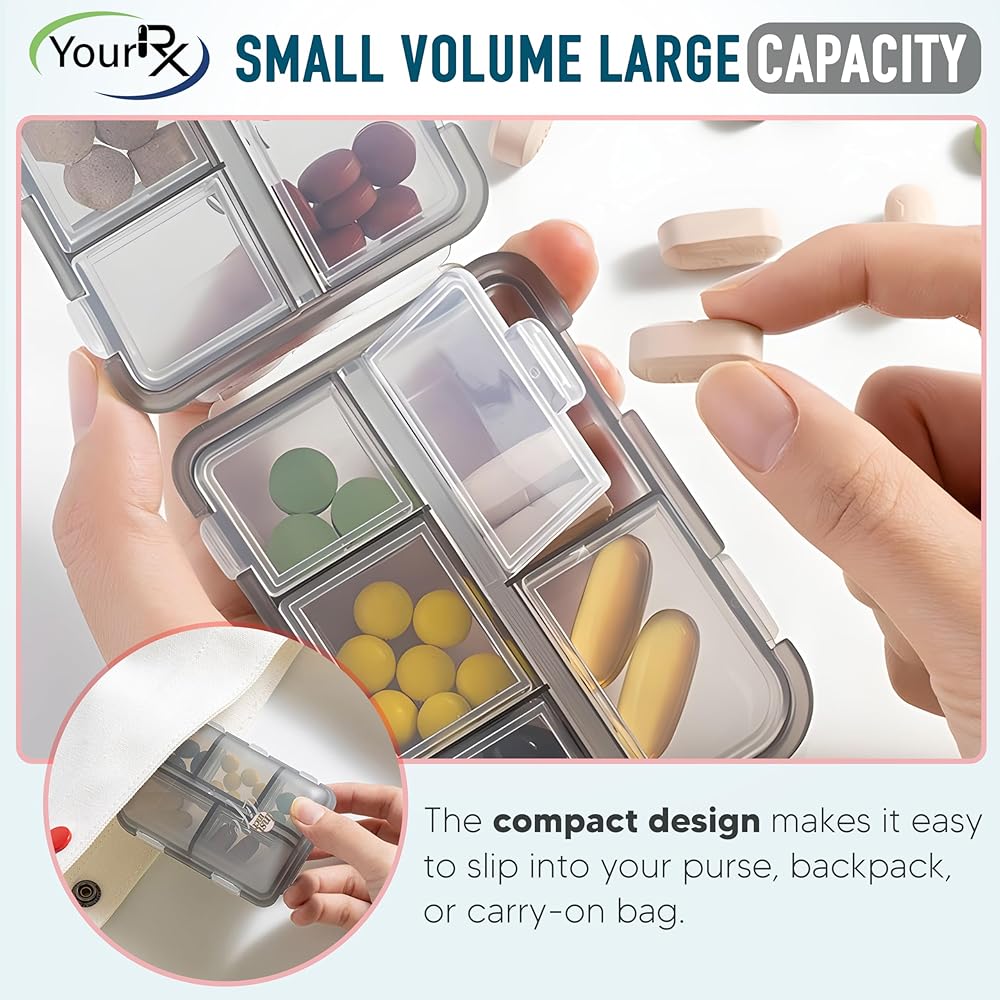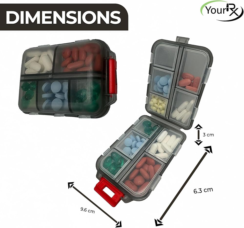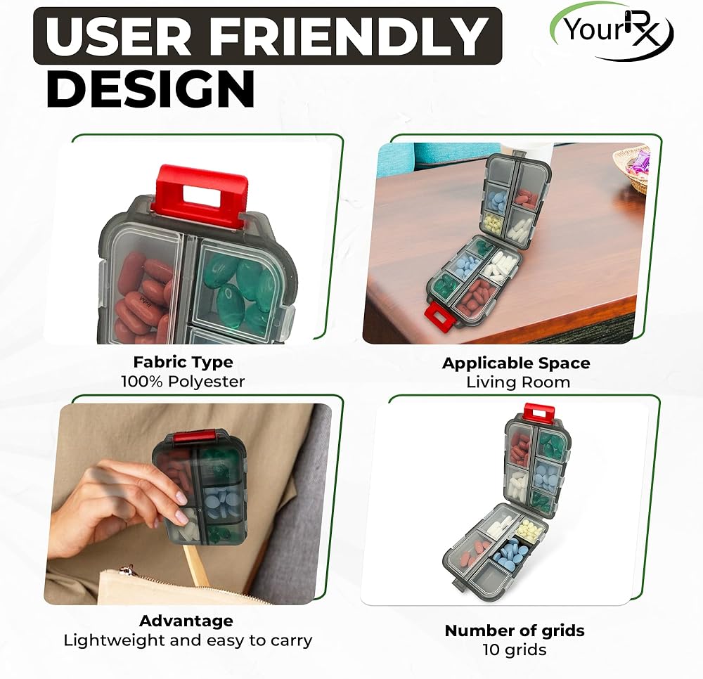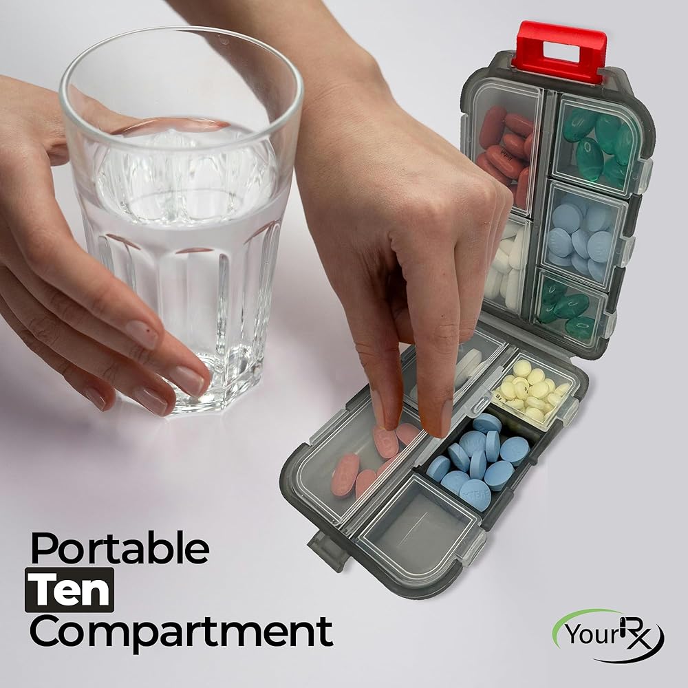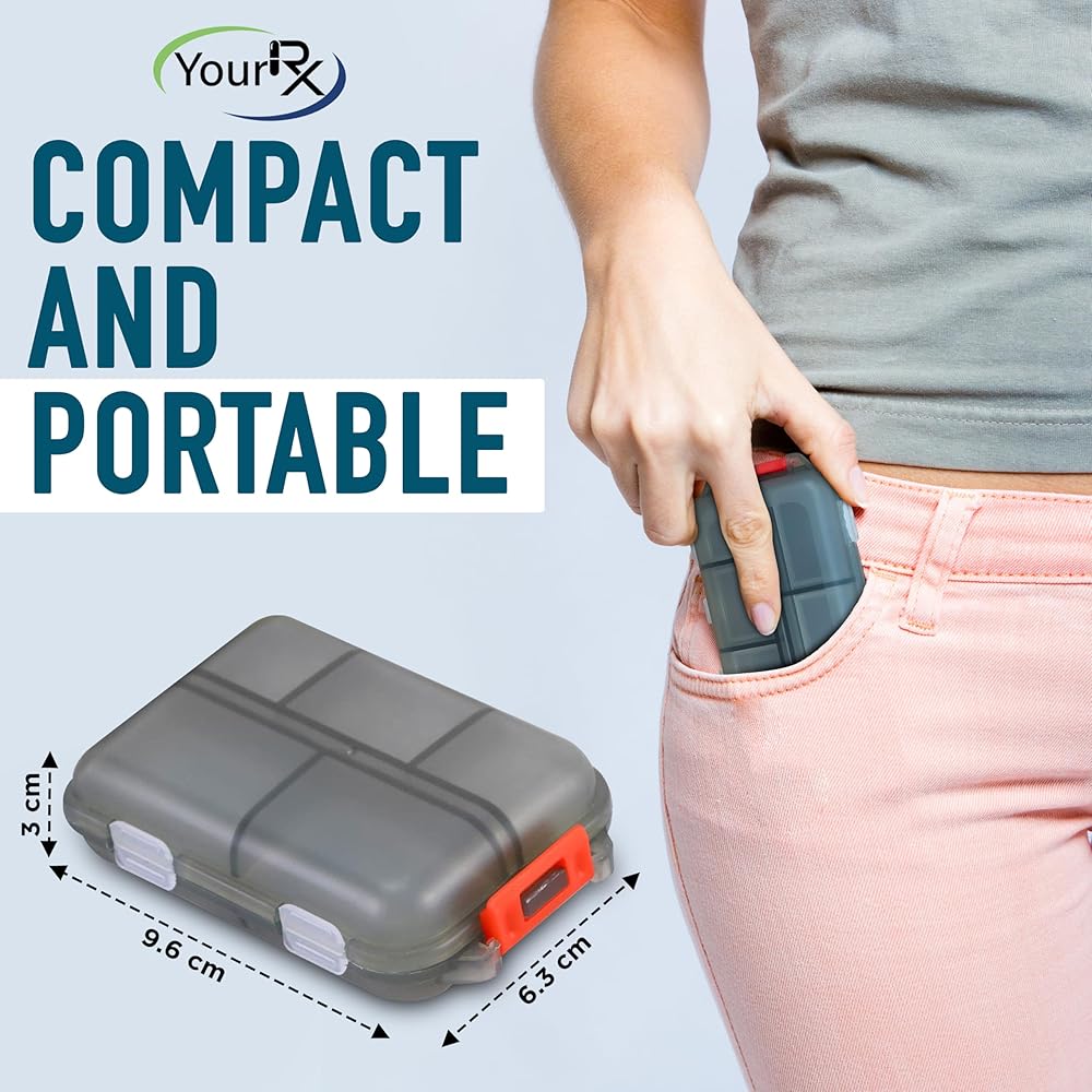 Keep your medication organized and secure with the YourRx Travel Medicine Organizer! This compact yet spacious pill case features 10 individual compartments of varying sizes, perfect for storing tablets, capsules, and supplements. Designed with secure individual lids on every compartment and one airtight lid, it ensures your medicine stays fresh and spill-free, even when you're on the move. Made from durable, food-grade plastic, this lightweight pill container easily fits in your pocket, purse, or luggage, making it the ideal travel companion for maintaining your health routine wherever you go.