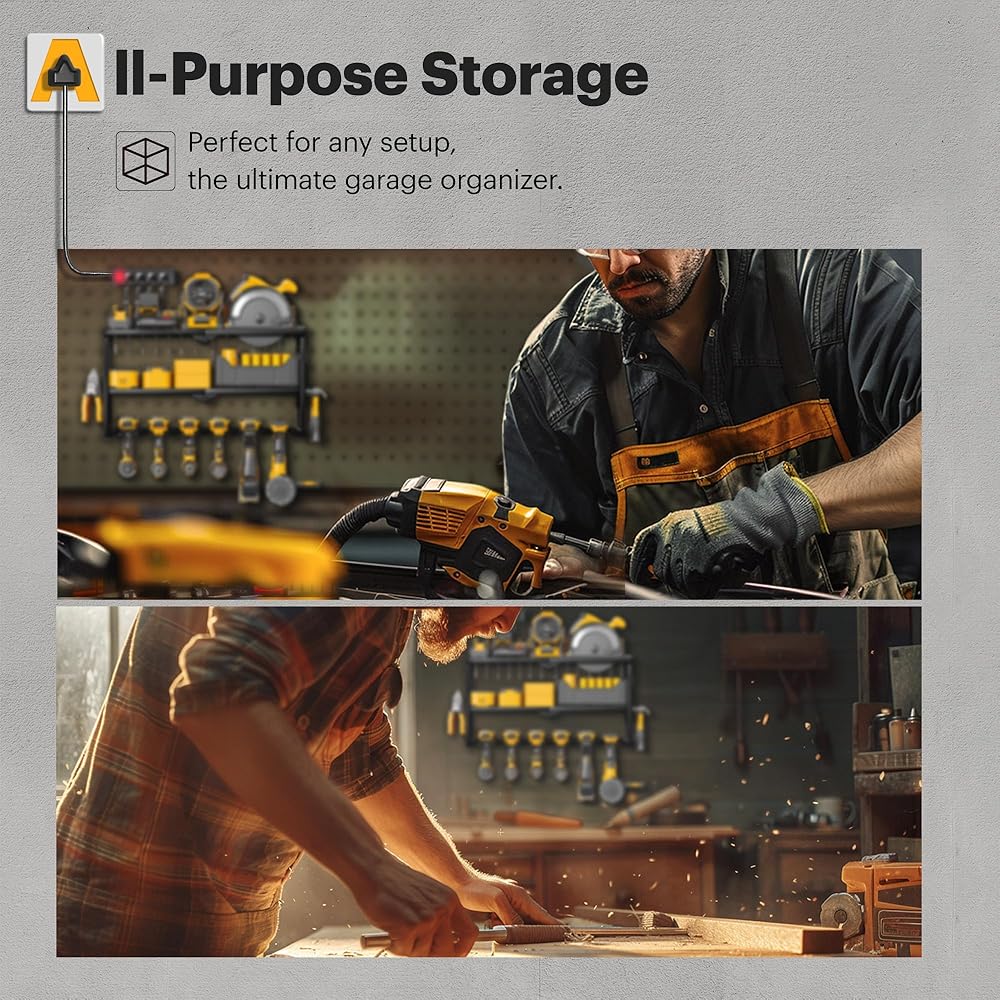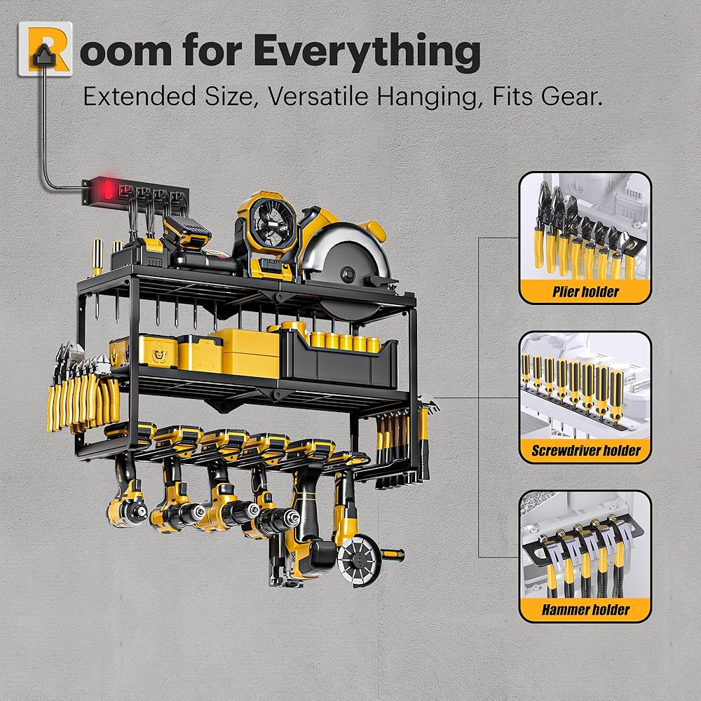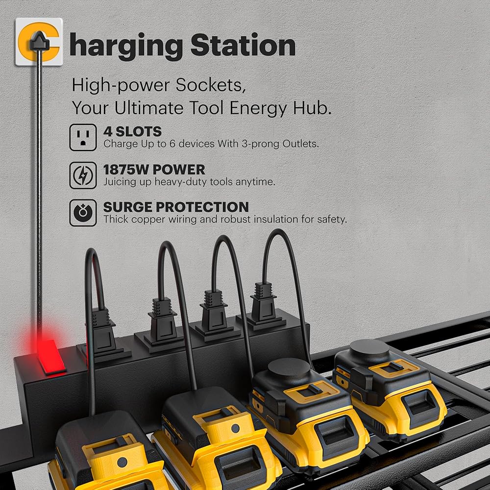 • Power Tool Organizer with Charging Station: Equipped with 4-6 outlet power strips, it offers great convenience for charging your tool batteries. You can charge everything on the tool rack, eliminating the need to search for sockets and enhancing work efficiency