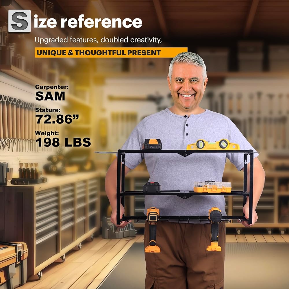 • Quick assembly and load-bearing capacity: The tool organizer is made of thickened heavy-duty steel metal, which has greater weight and durability. The total load-bearing capacity of the drill organizer is up to 100-150Lbs. Please refer to the instructions for installation, and you can assemble a perfect tool storage shelf in 15 minutes. The best gift for men or Father's Day