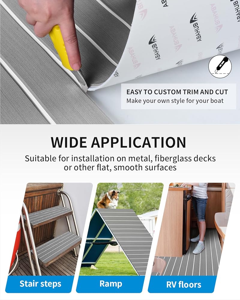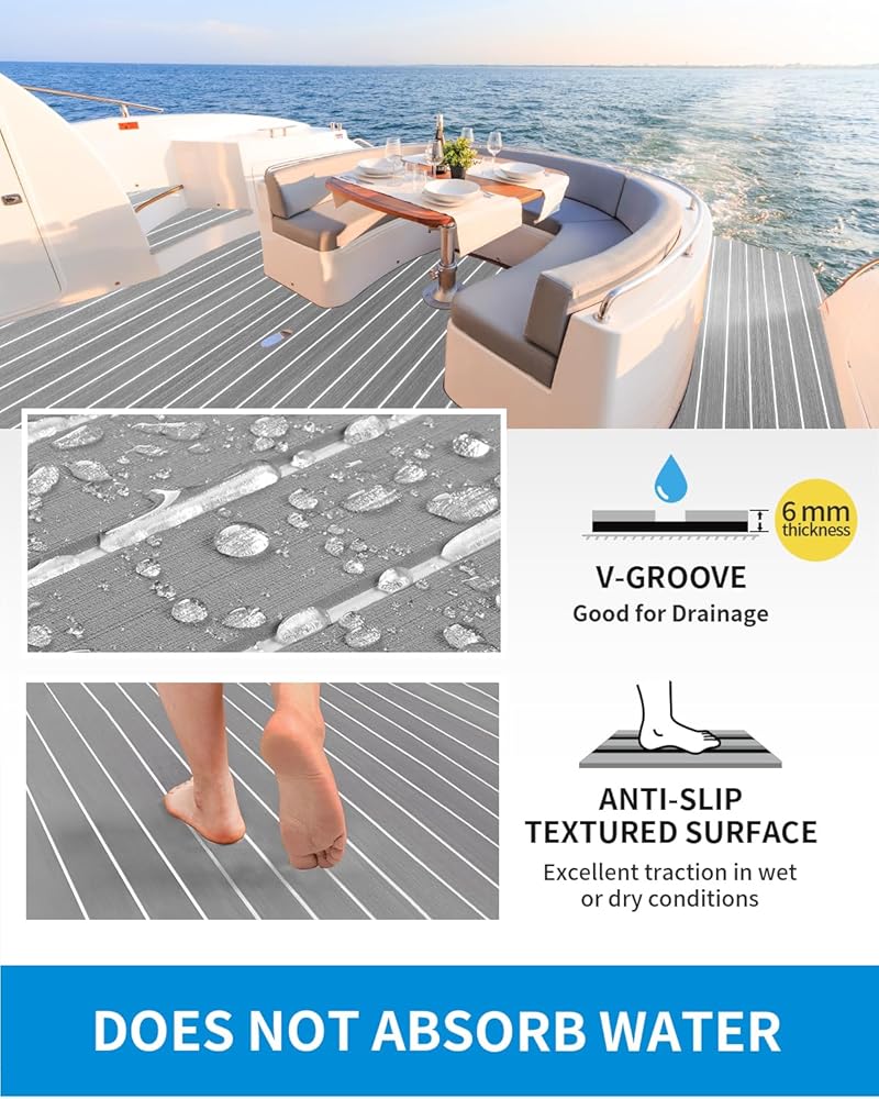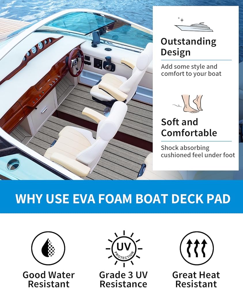 Premium 6 mm Thick Eva Foam: Premium soft boat decking material provides great heat resistance, water resistance and level 3 UV stability for durability in harsh climates; eva foam gives you a shock-absorbing cushioned feel under foot; protects boat surface from scratches, reduces noise; it is recommended for installation on metal or fiberglass decks or other flat, smooth surfaces; hardness: 50-55 degree