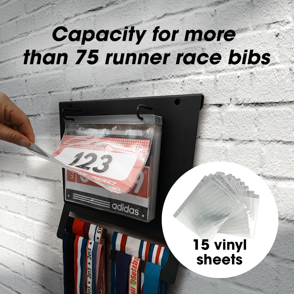 [Large Capacity for Bibs and Medals] Includes 15 bib sleeves, each fitting at least 5 bibs, for a total capacity of up to 75 race bibs. The sturdy hooks can display over 40 medals, keeping your achievements neatly organized.