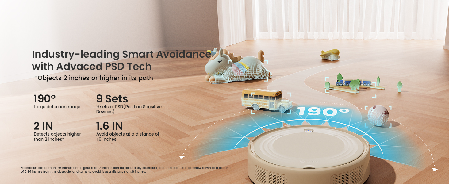 All-New Intelligent Obstacle Avoidance: The M310 uses PSD technology with 9 Position Sensitive Devices; detects obstacles at 1.6 inches and avoids objects as small as 0.6 inches within a 190° field of view; ensures efficient and seamless cleaning paths