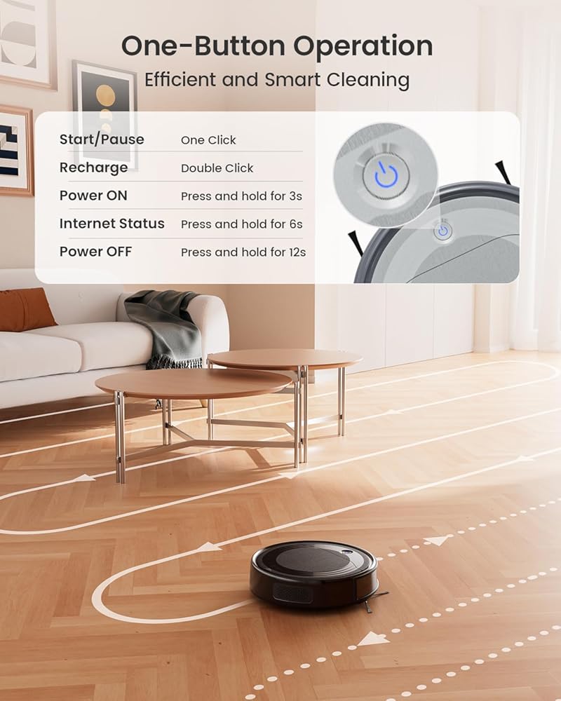 Easy Start: M310 robot vacuum will automatically turn on when charging begins, just one-click to start/pause, press and hold for up to 12 seconds to shut down. NOTE: If you don't use it for a long time after charging complete, please turn it off and avoid power loss.