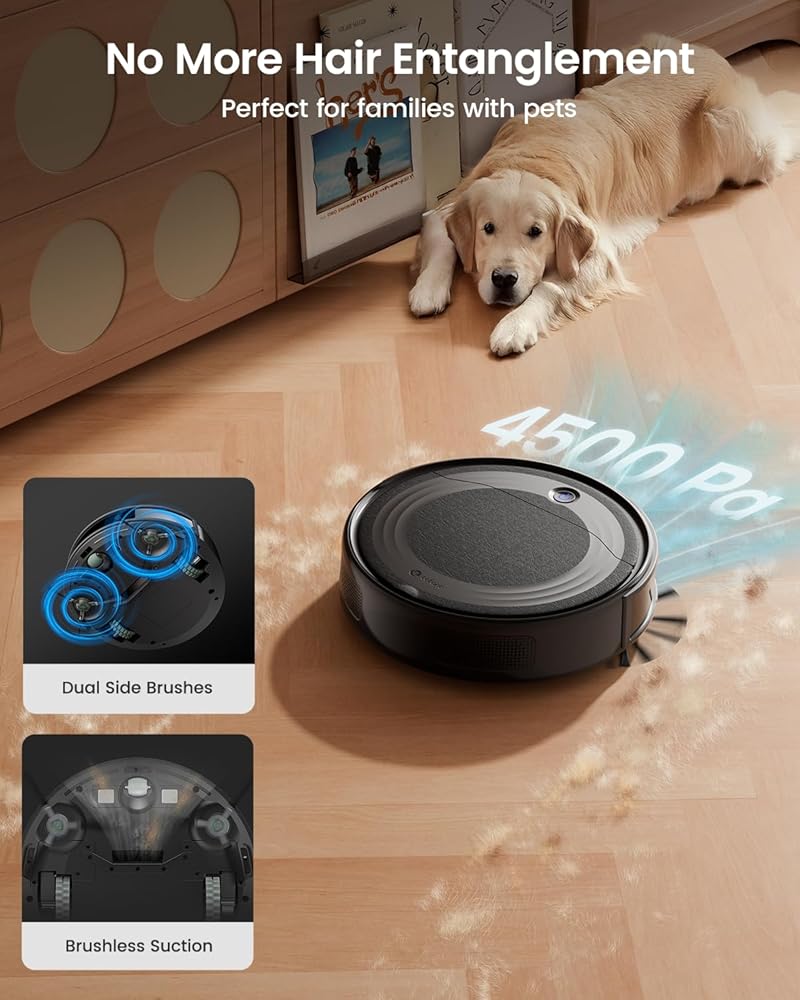 Strong Suction for Deep Cleaning: Lefant M310 delivers 4500Pa suction power with dual side brushes; effectively cleans dust, pet hair, crumbs, and debris from hardwood floors and low-pile carpets; no-entanglement design eliminates the need for manual cleaning