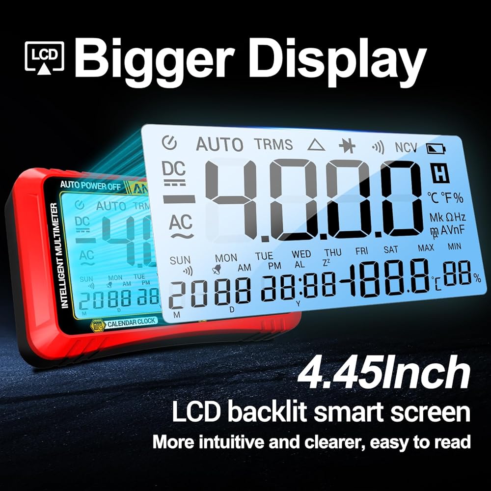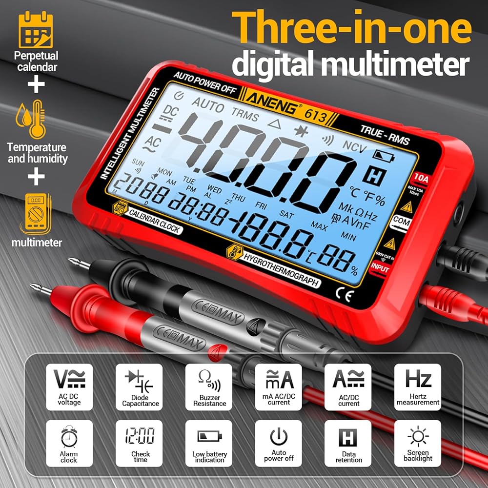 【Special and Reliable】Aneng electricity tester not only provides essential measurement functions but also features a calendar and alarm clock, allowing you to keep track of time while you work. Additionally, it offers real-time temperature display, enabling you to monitor environmental changes.These convenient extra features make this ohm meter multimeter a versatile and reliable tool to provide reliable readings every time for your work