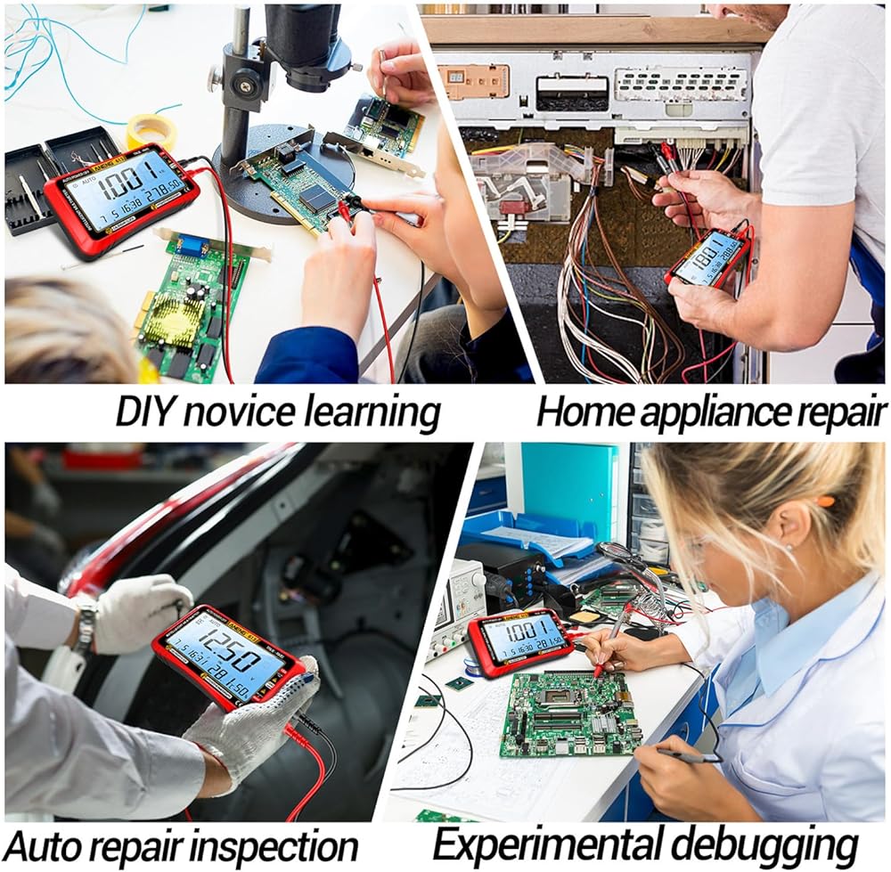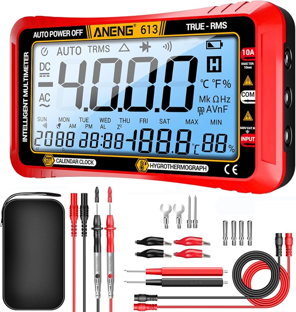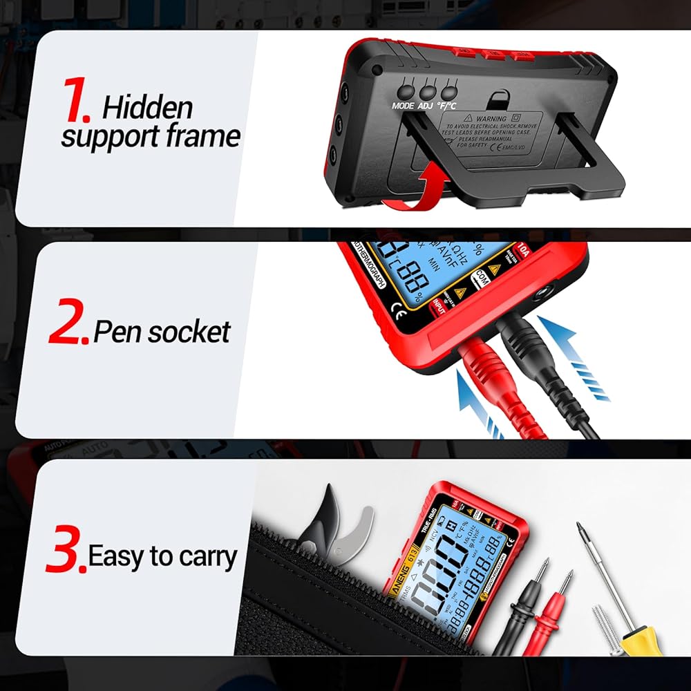 【Smart Digital Multimeter Tester】ANENG 612 voltmeter with auto mode, allows you to quickly switch all measurement tasks,including AC/DC voltage,current,resistance,and continuity,capacitor,ohm without selecting a mode or range.It makes measuring work easy,fast,and accurate.With data hold, low battery indicator, backlight display.Would be a great gift for househould DIY beginners and advanced professionals