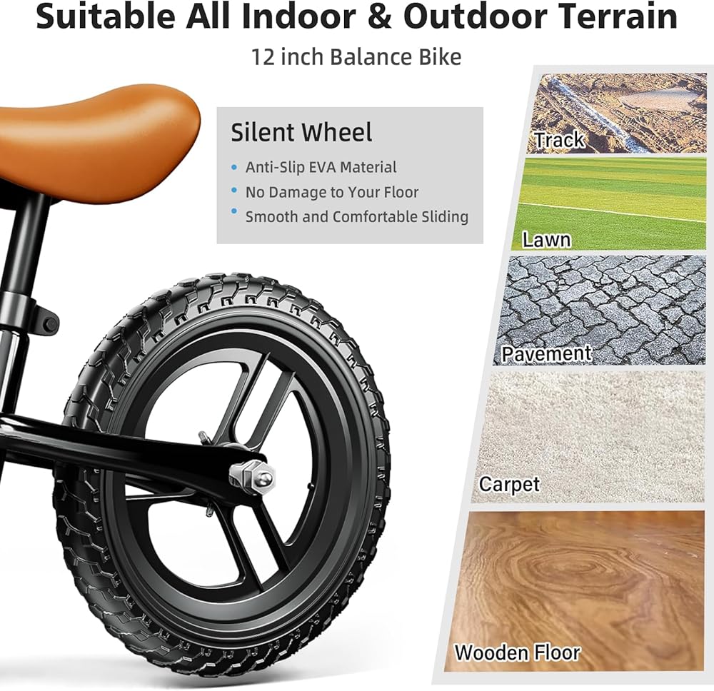 The kids balance bike for 2 3 4 5 year old kids,it equipped with 12 inch extra-thick silent-wheel tires, make your children safe and stable while ridding.