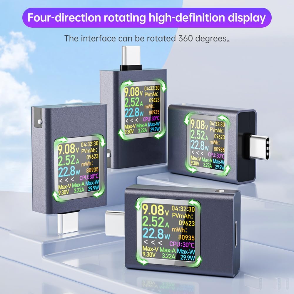 【Real-Time Peak Value Recording】USB-C tester allows you to check the max-voltage, max-current, and max-power values during charging period, easily to determine the extreme charging power of phones, chargers, power bank etc. The AT085 USB-C tester adds a gravity acceleration sensor and the display can automatically rotate the screen in 4 directions to provide you with the better reading experience(Note: Press the confirmation button 5 times consecutively to enter direction lock mode).