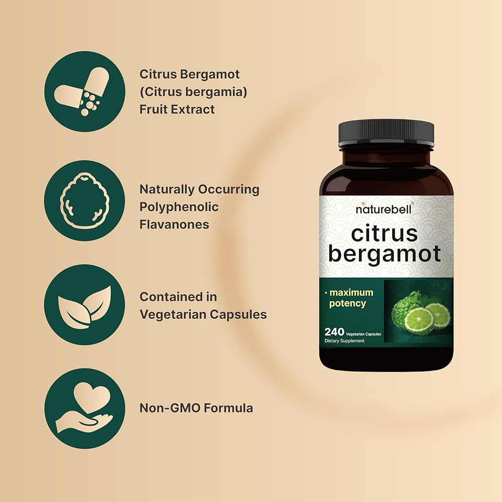 240 veggie capsules per bottle, provides 5,000 mg of real bergamot from citrus bergamia, lasts up to a 4-month supply.