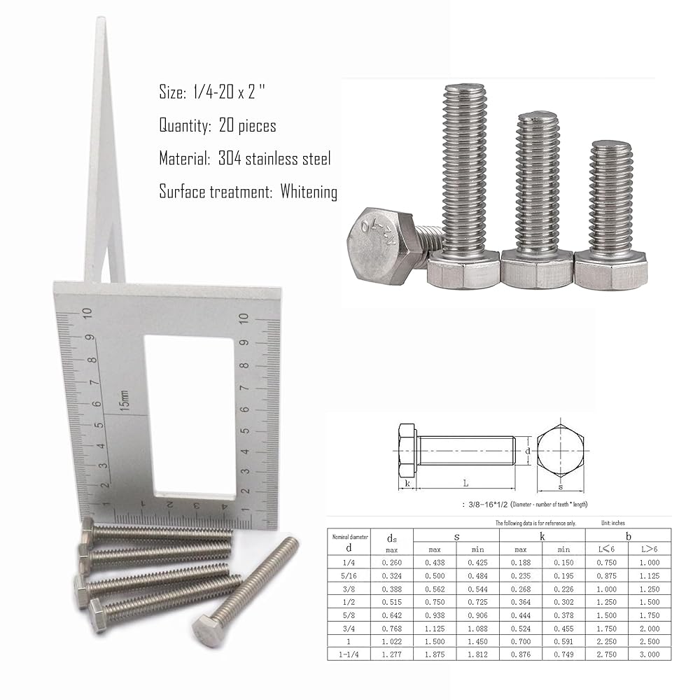 20pcs Hex Head Screw Bolts, (1/4-20 x 2) Hex Head Bolts, (Full Thread), 304 Stainless Steel (Silvery)