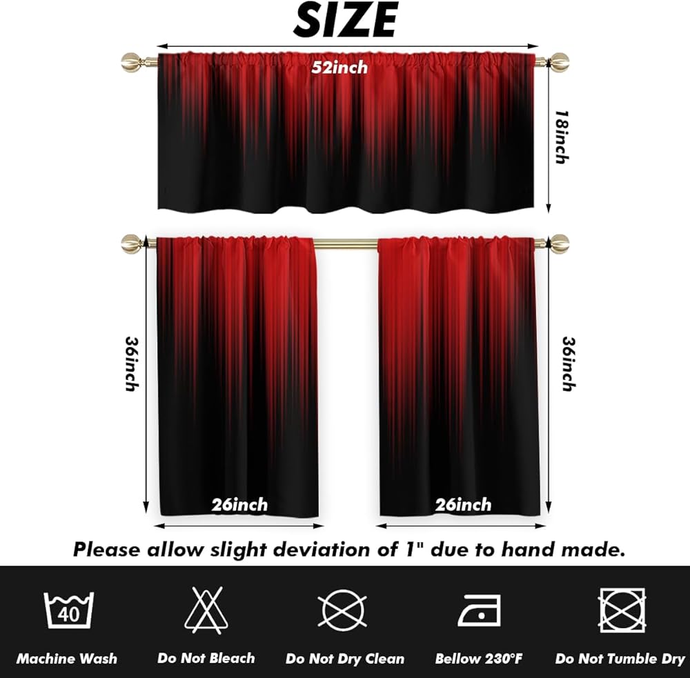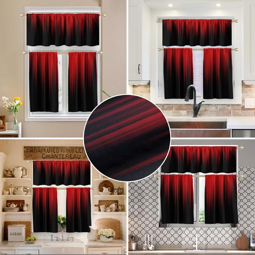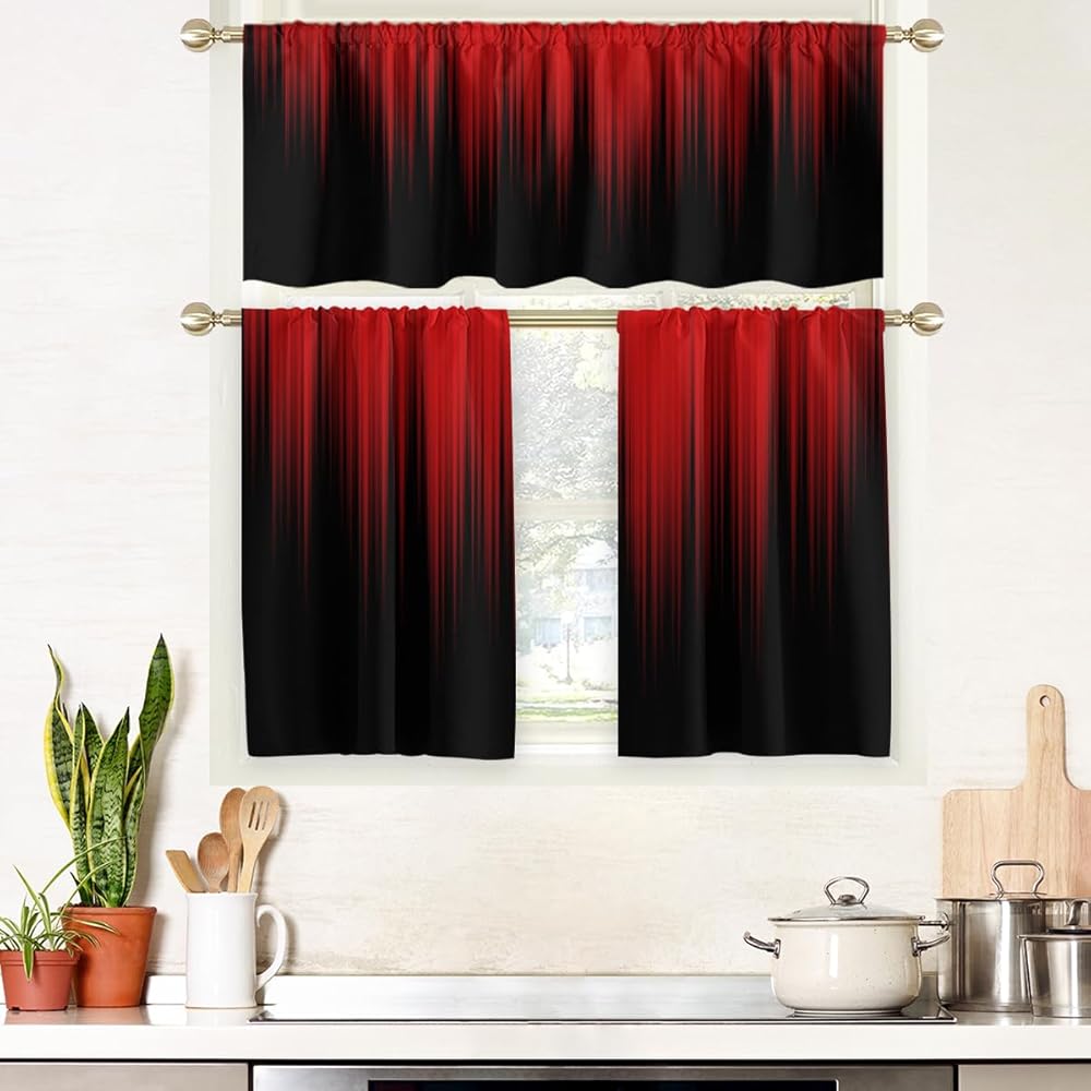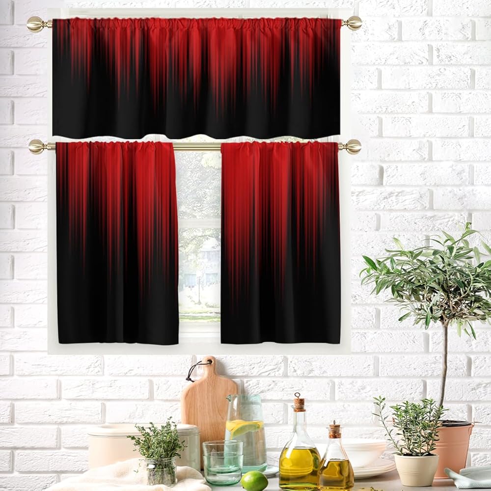 AAtter Red and Black Kitchen Curtain Valance and Tiers Set 3 Piece Abstract Burgundy Gothic Goth Ombre Striped Rod Pocket Small Short Living Room Bedroom Bathroom 52x18 inch + 26x36 inch*2