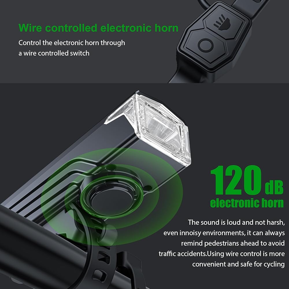 🚴🚴🚴【Bike Lights with 120dB Electronic Horn】Super bright bicycle lights can be switched between 5 modes, the bottom of the bicycle lights is equipped with an electronic horn, bike light with wire controlled switch can control the bicycle lights and electronic horn, making it convenient for cycling operation, suitable for night city mountain roads cycling