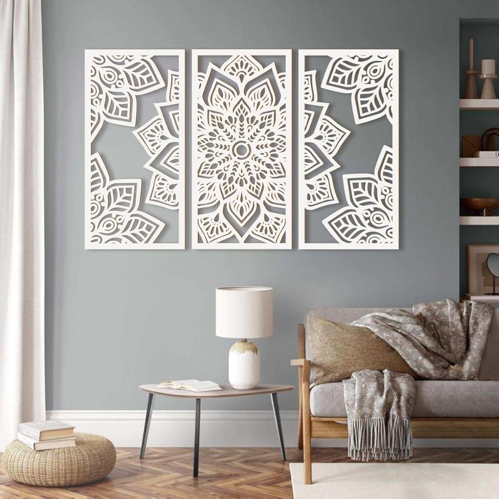 Mandala Wall Art 16x32 Inch Lotus Flower Wall Art Decor Large White Mandala Wood Wall Decor Lotus Art Hollow Wall Decor 3 Panels for Living Room Bedroom Office Wall Decor