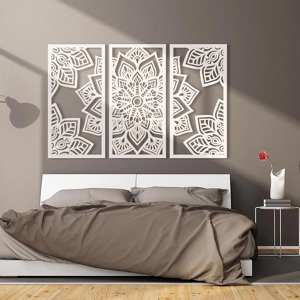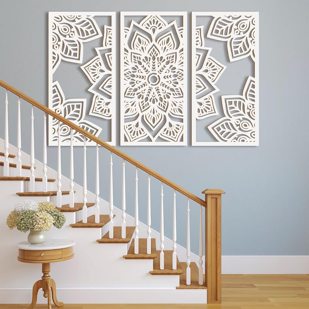 【Lotus Flower Wooden Wall Art】 16*32 inches, set of 3 wood wall panels. Lotus is a symbol of Buddhism, representing holinessand purity. This mandala wall wood decor creates a calm and peaceful atmosphere through the combination of design elements such as lotus flowers, geometric figures and hollowing out.