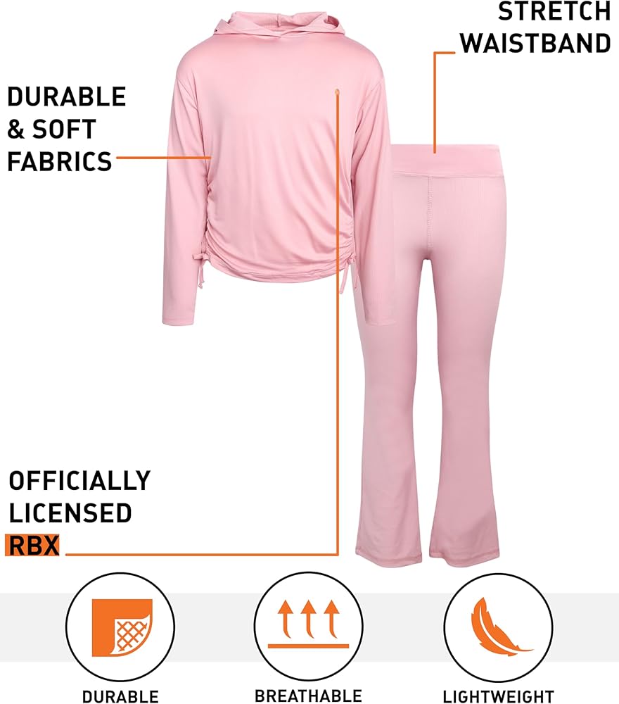 Introducing the RBX Girls' Essential Sets, a must-have activewear collection for girls who love to stay comfortable and stylish. Each 2-piece set includes a chic top - available as a cozy pullover hoodie or a trendy quarter-zip mock neck - paired with fashionable flare leggings. Designed with high-quality materials, these sets are perfect for school, sports, or casual outings. The pullover hoodie features a soft, ribbed fabric that provides warmth and comfort, making it perfect for chilly days. The quarter-zip top, with its mock neck and adjustable drawstring hem, offers a versatile and stylish option for layering. Both tops come with a snug, tailored fit that ensures your girl can move freely and confidently. The flare leggings are a standout feature, providing a retro-inspired look with a modern twist. These leggings are not only stylish but also incredibly comfortable, thanks to their stretchy fabric that moves with your girl. The wide waistband ensures a secure fit, while the flare at the bottom adds a fun and fashionable touch. Ideal for pairing with sneakers or boots, these leggings are a versatile addition to any wardrobe. These sets are perfect for girls who want to stay active and stylish, offering both comfort and versatility. Whether heading to school, hanging out with friends, or relaxing at home, the RBX Girls' Essential Sets are a great choice for any occasion.