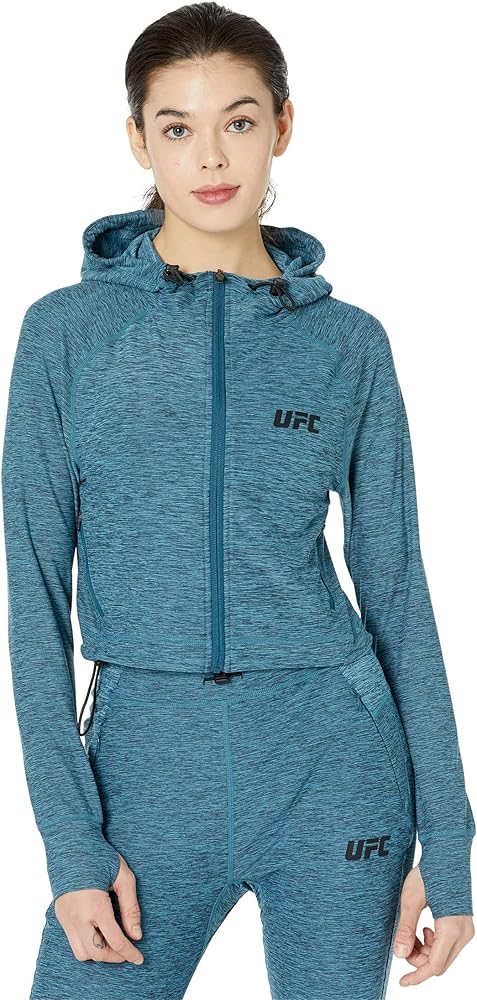 Cover up wearing the soft and stretchable UFC Long Sleeve Full Zip Hooded Jacket, perfect for everyday wear. Adjustable attached hood. Long raglan sleeves. Full-length center-front zippered closure. Signature brand name logo on the upper left chest. Two hand pockets. Straight hemline with a toggle for a precise fit. 87% polyester, 13% spandex. Machine wash, tumble dry. Imported.