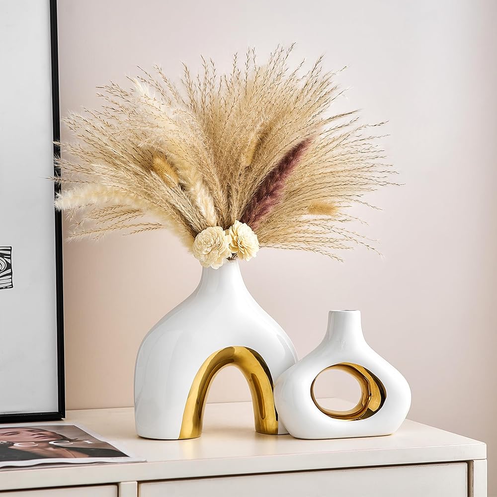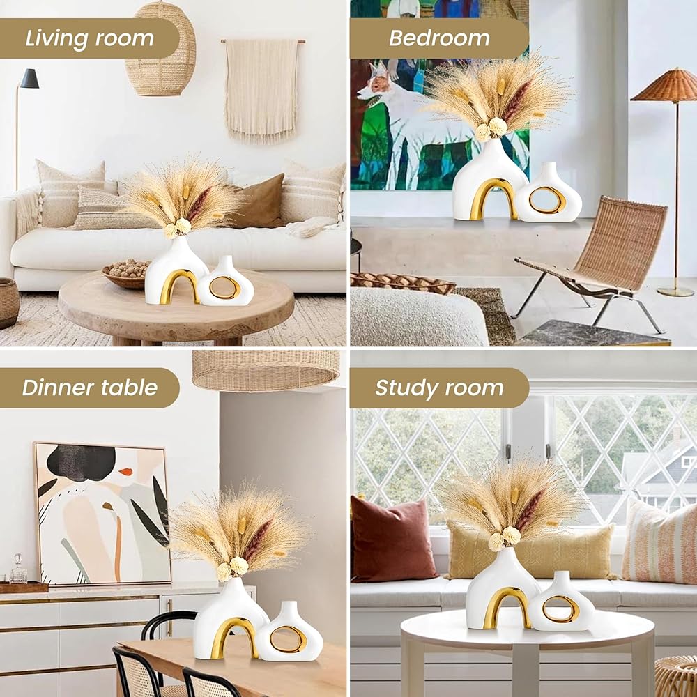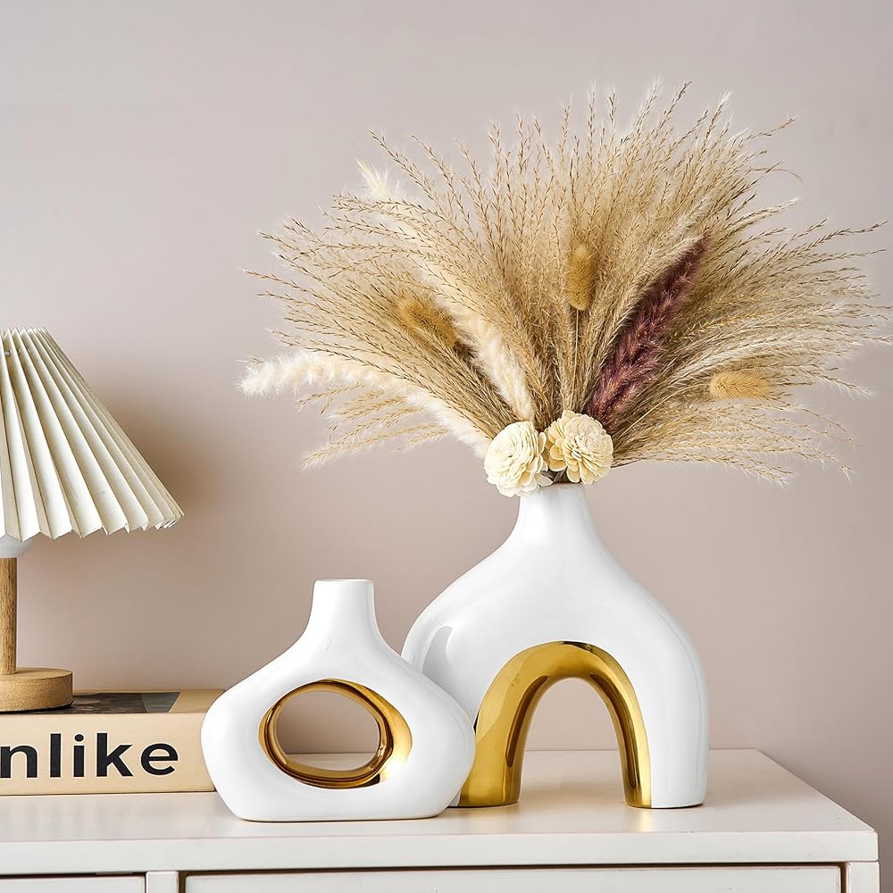 MULTI-PURPOSE VASES FOR CENTERPIECES - This ceramic black and gold vase set of 2 will hold pampas grass, dried flowers, reeds, fresh flowers, succulents and more nicely, and also be a centerpiece for your living room, entryway table, bedroom, coffee table, office, wedding, bookshelf. The two-color design of the donut round vase makes the vase beautiful with or without flowers, and it will add a beautiful artistic landscape to your home decor.