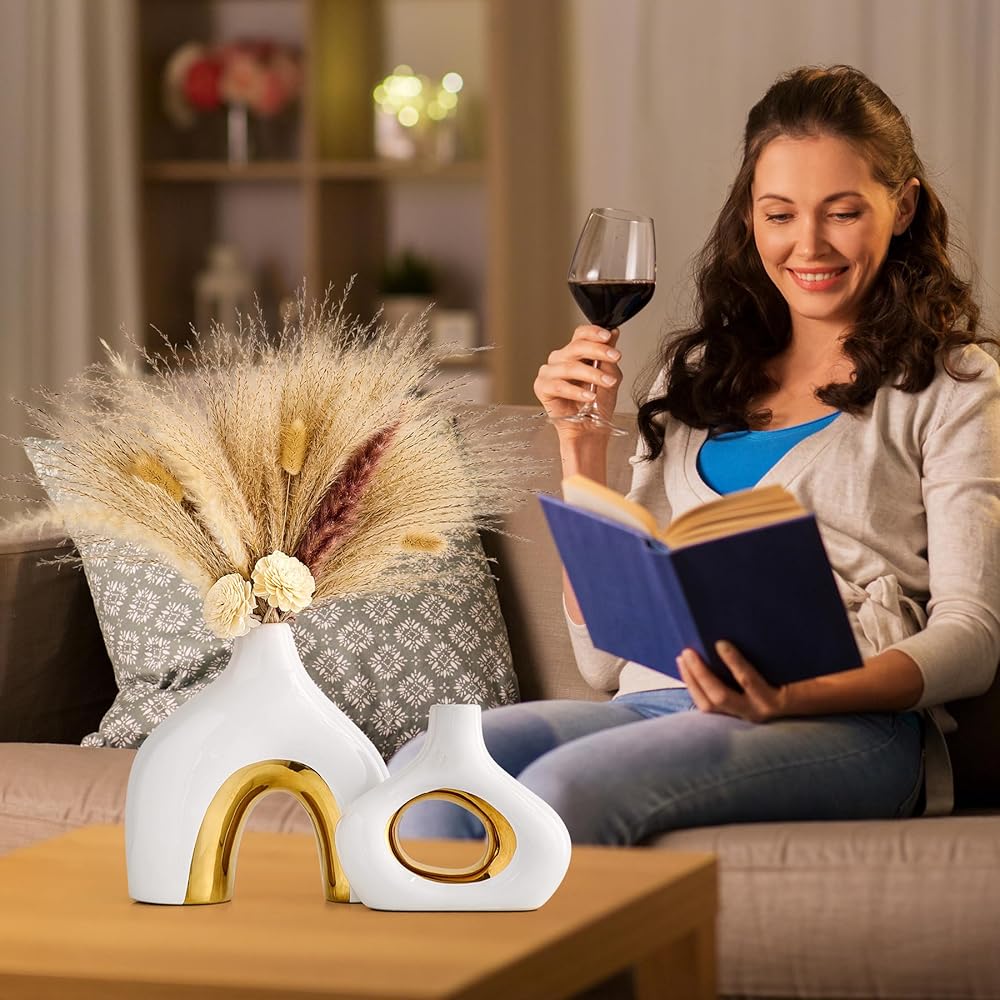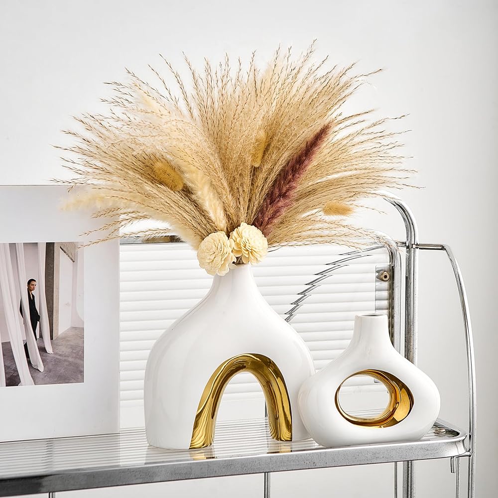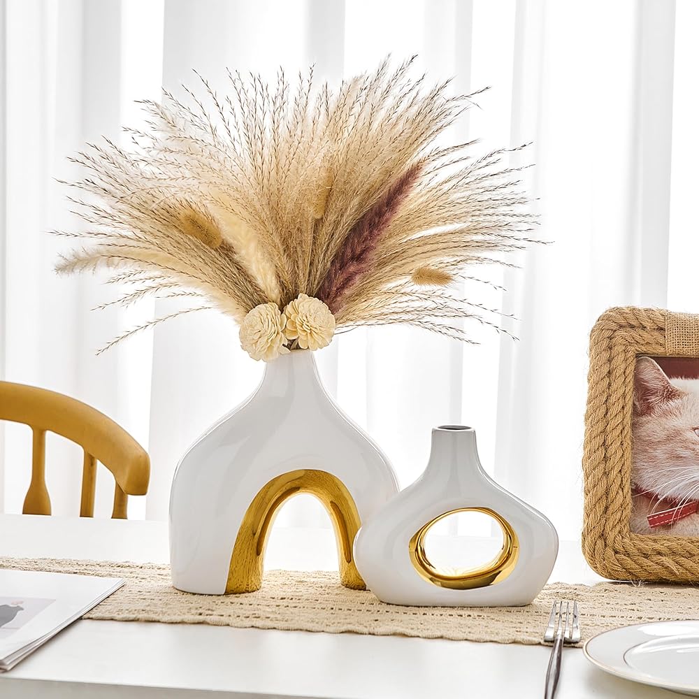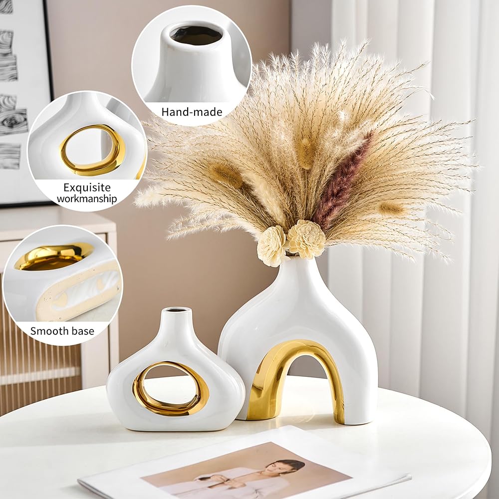 MULTI-PURPOSE VASES FOR CENTERPIECES - This ceramic black and gold vase set of 2 will hold pampas grass, dried flowers, reeds, fresh flowers, succulents and more nicely, and also be a centerpiece for your living room, entryway table, bedroom, coffee table, office, wedding, bookshelf. The two-color design of the donut round vase makes the vase beautiful with or without flowers, and it will add a beautiful artistic landscape to your home decor.