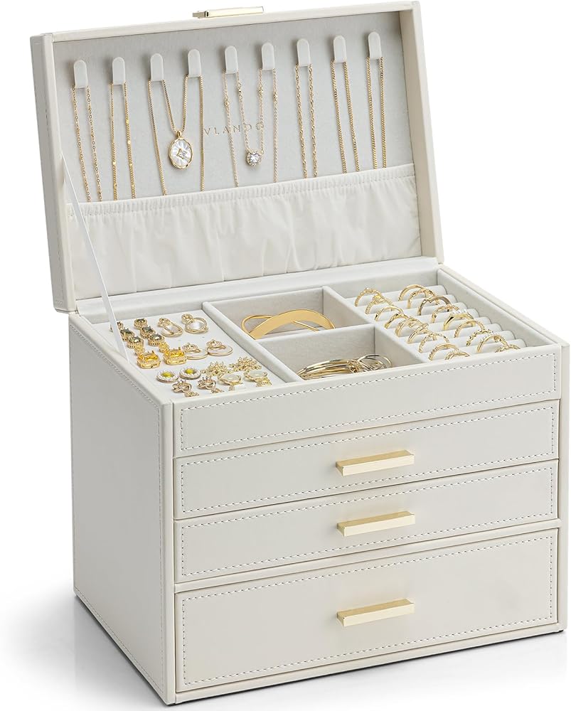 Vlando 4 Layer Large Jewelry Box - Jewelry Holder Organizer, Jewelry Box Organizer for Drawer Necklace Ring Bracelet and Watch, Birthday Gift for Loved Ones - Beige