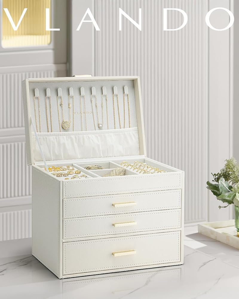 6 LAYERS OF LARGE CAPACITY- Vlando jewelry box has multifunctional storage compartment, drawer with 18 grids, 6 grids, for rings & ear studs, necklaces, bracelets, watches. It offers sufficient storage space for all your jewelry, and finally lets you store your jewelry properly.