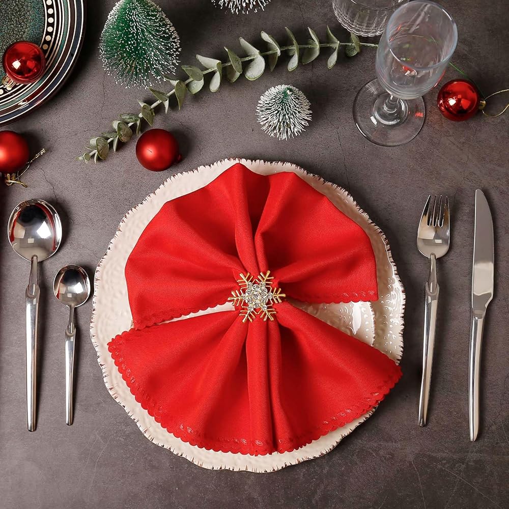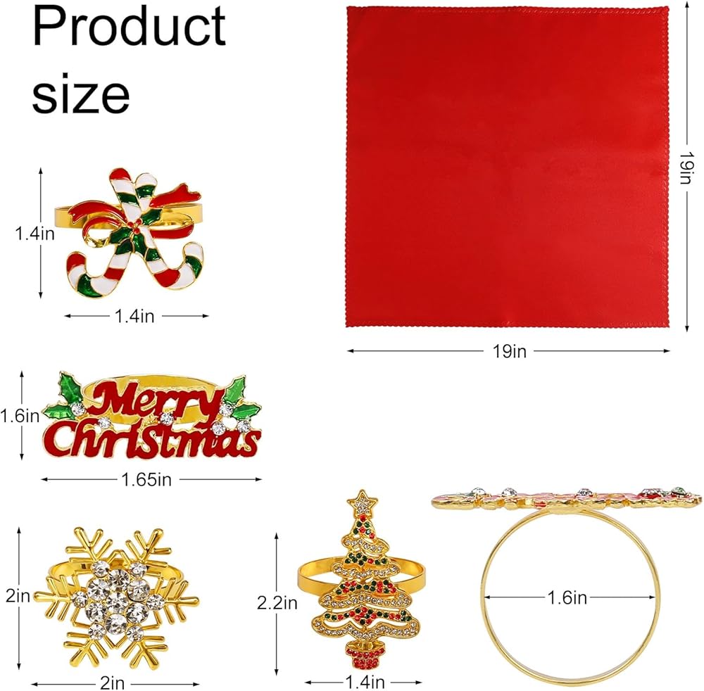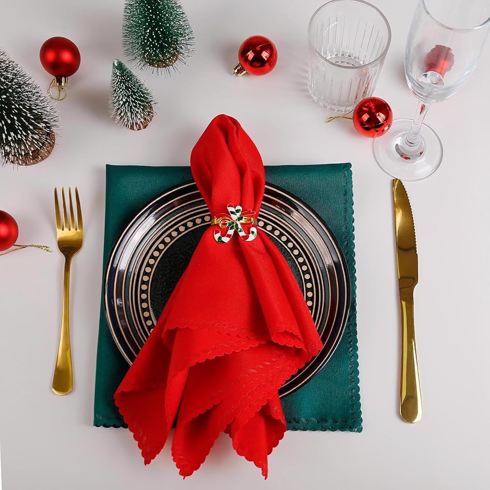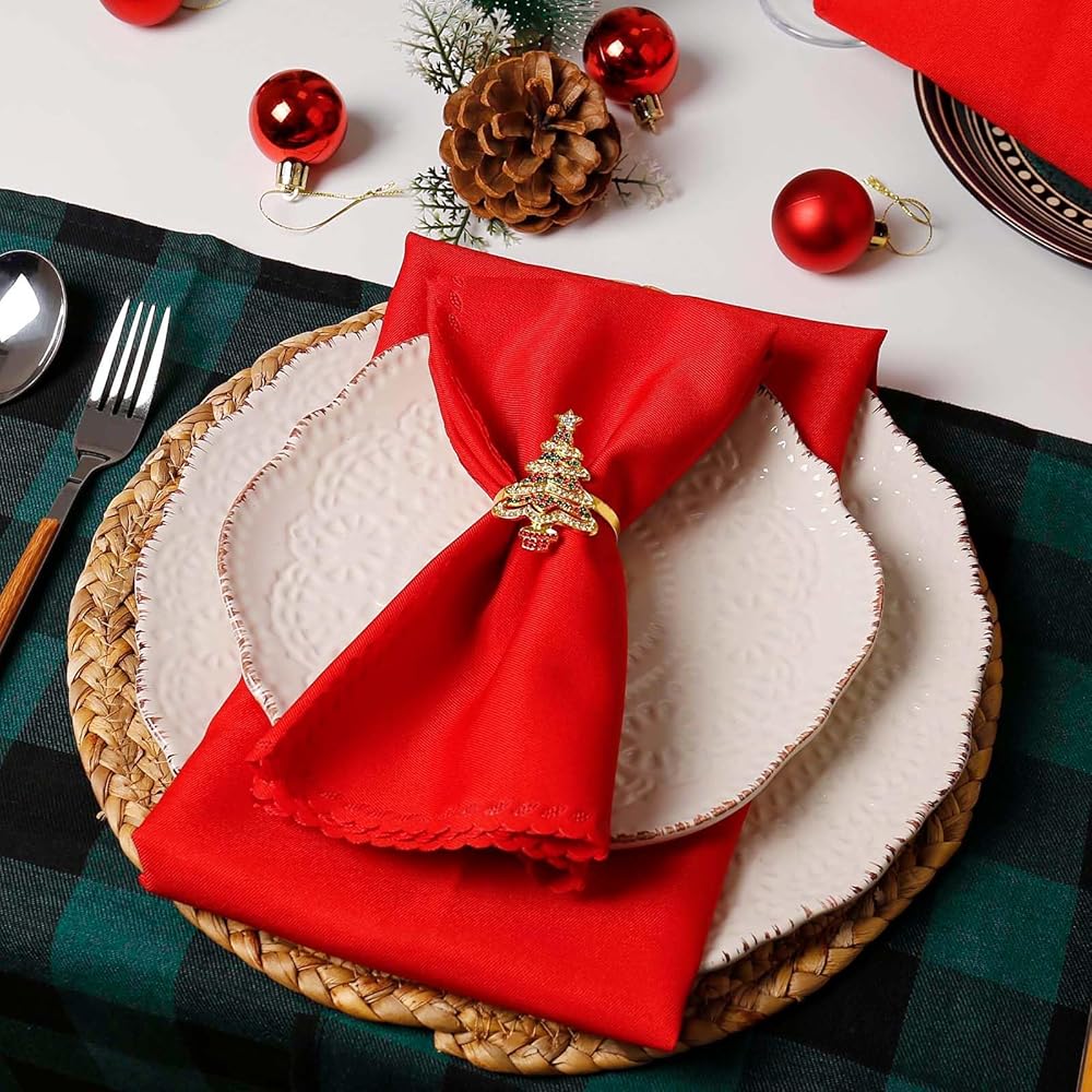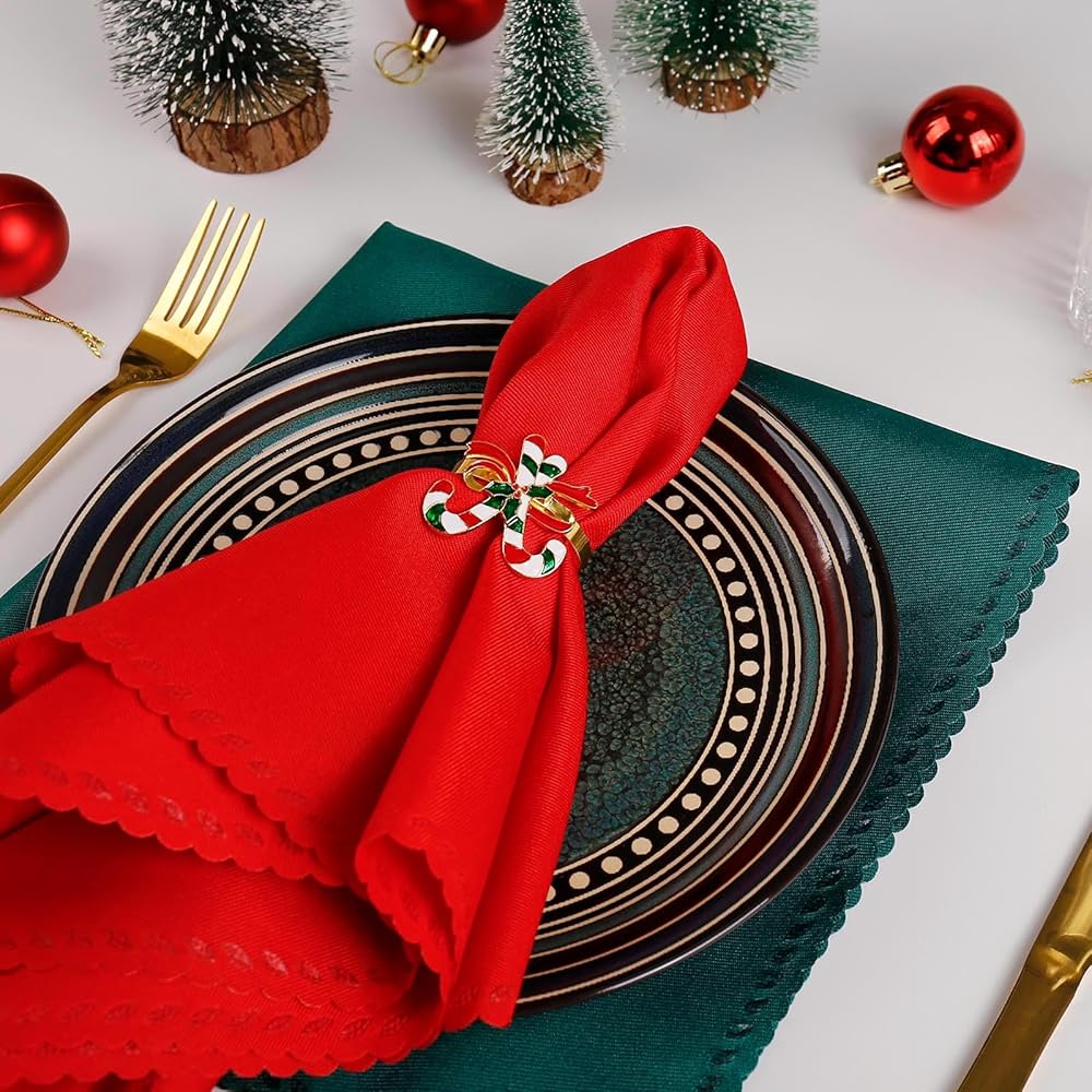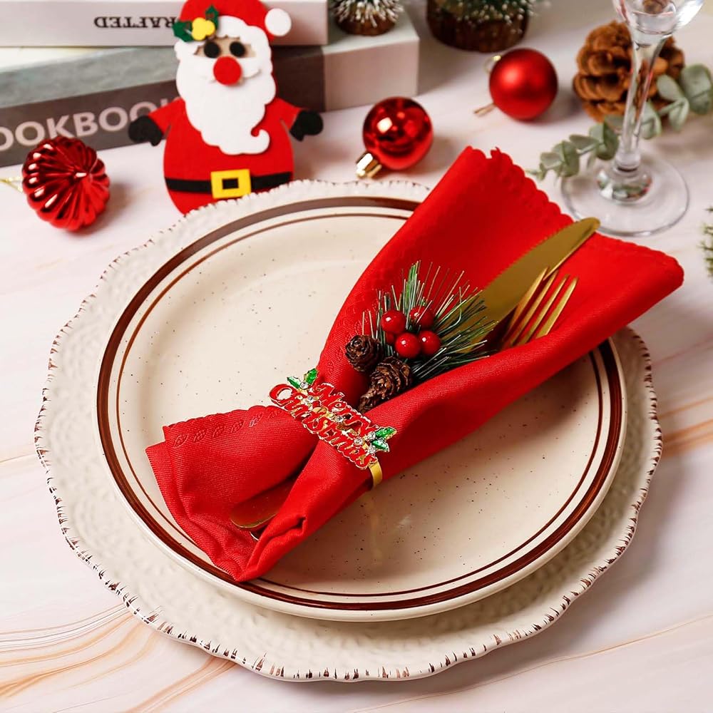 Christmas Napkin Rings and Cloth Napkins Set of 16pcs, 8 Pieces Red Polyester Cloth Napkins Plus 8 Pieces Merry Christmas Metal Napkin Rings for Xmas Gathering Party Dinner Table Decor