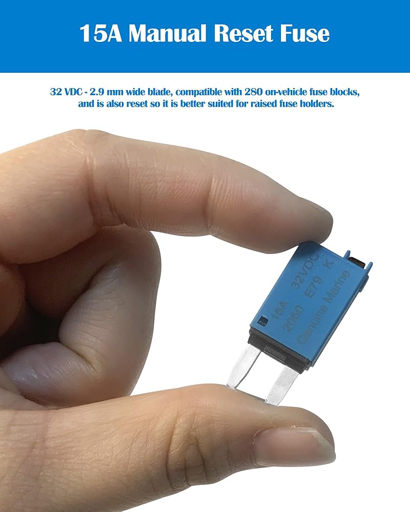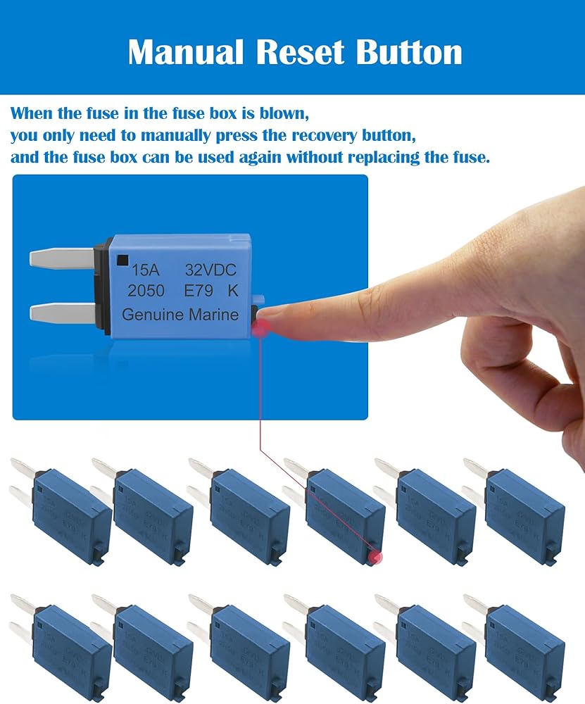 Nerites 15A Resettable APM/ATM Mini Fuse Kit – Manual Reset Circuit Breaker for Automotive, RVs, Boats, Trucks, SUVs, ATVs, UTVs, Motorcycles. Low Profile Mini Fuses, DC 32V, Pack of 12. Ideal for radios, lights, turn signals, and more. Easily reset after short circuits; no need to replace fuses. Suitable for various DC applications including fleets and snowmobiles.