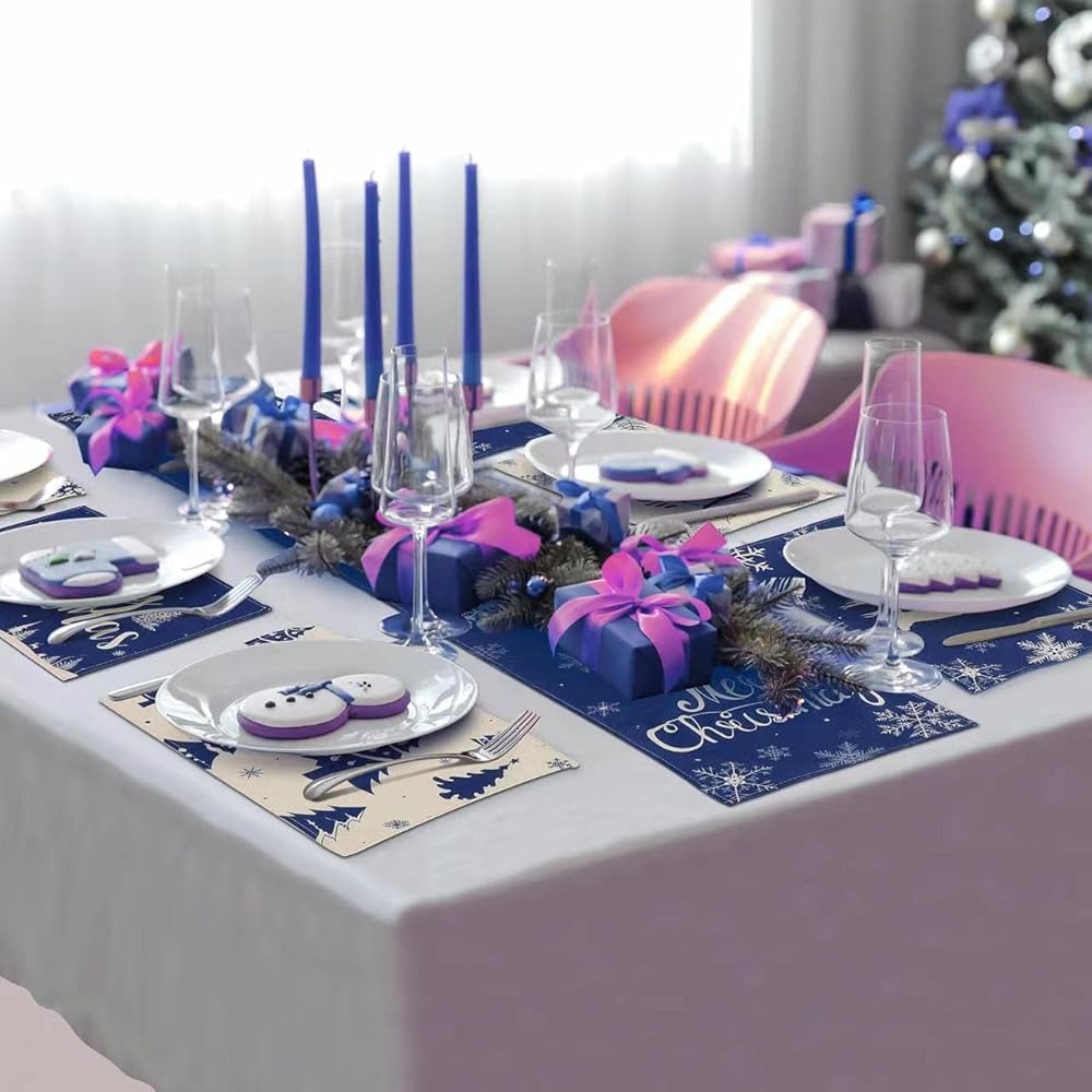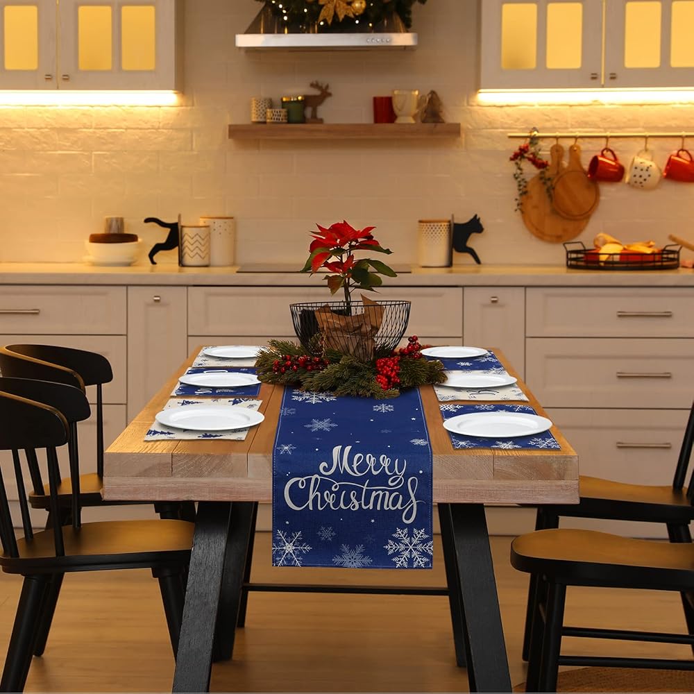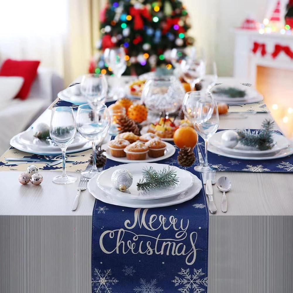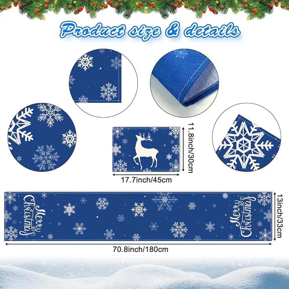 Jectivs 7Pcs Blue & White Snowflake Merry Christmas Table Runner Reindeer Snowflake Xmas Tree Let It Snow Table Mat Set for Christmas Winter Holiday New Year Table Decoration