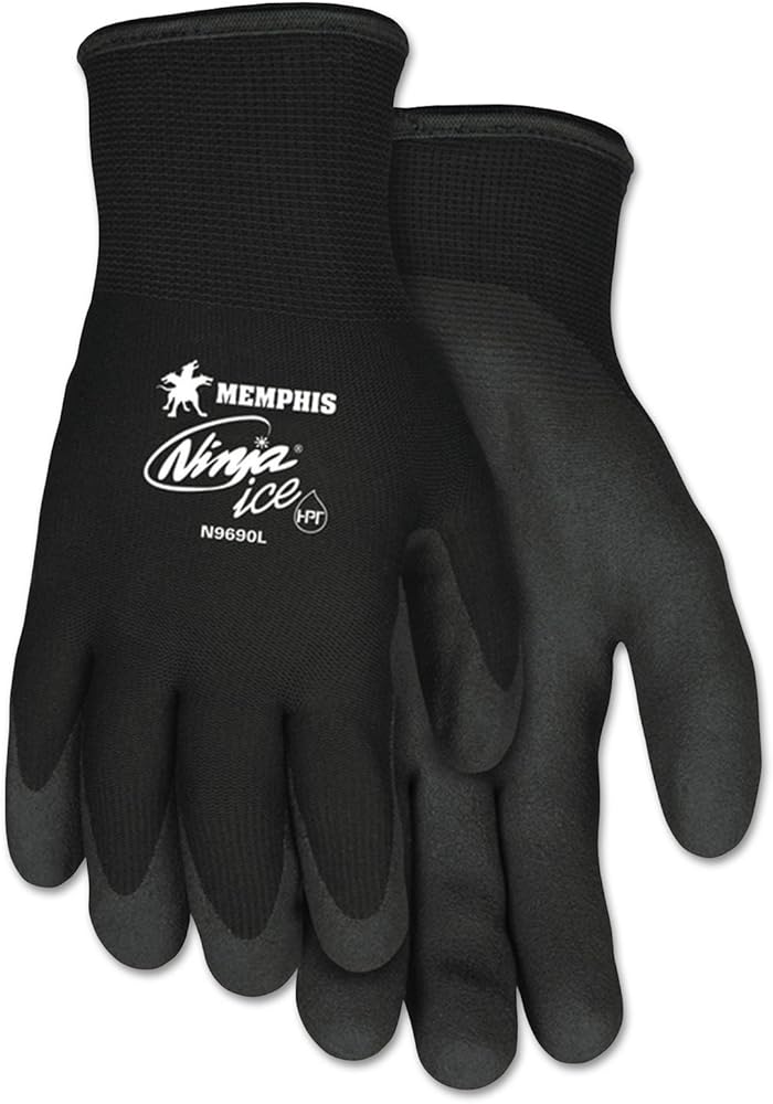 Memphis Ninja Ice Large Black Palm And Fingertip Coated HPT Foam Sponge Work Gloves feature a 15 ga black nylon shell with a 7 ga acrylic terry interior liner which offers the immense combination of dexterity, sense of touch and protection. Foam sponge gloves remain soft and flexible in temperatures as low as 50 deg C and black HPT coating repel liquids while providing a firm wet or dry grip. Promote freshness with enhanced durability. Work gloves find application in commercial fishing, construction, outdoor winter use and in cold storage.