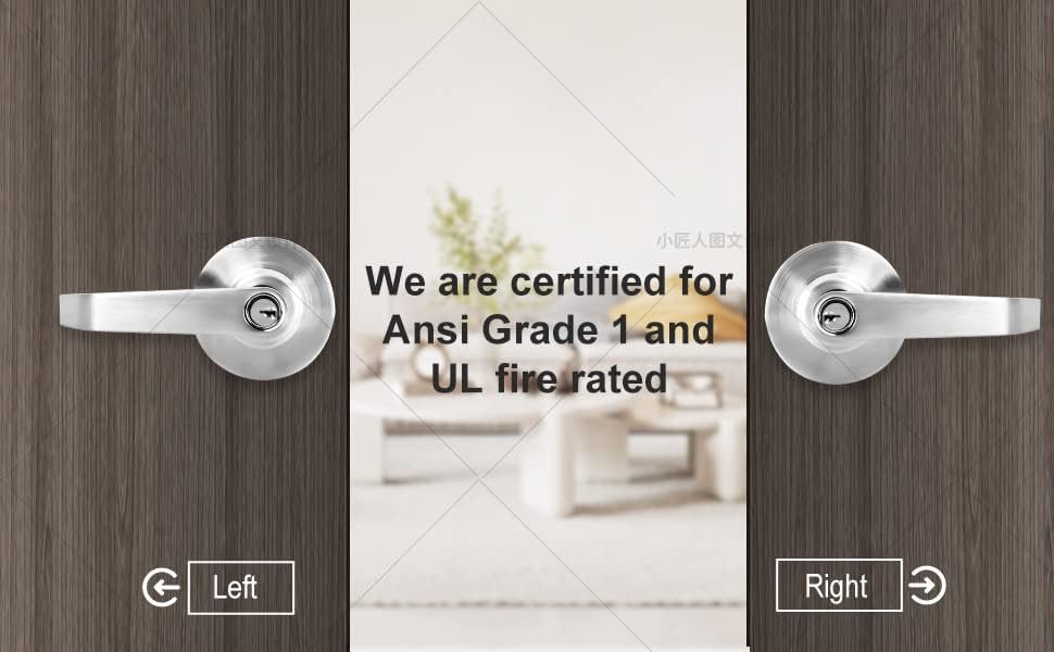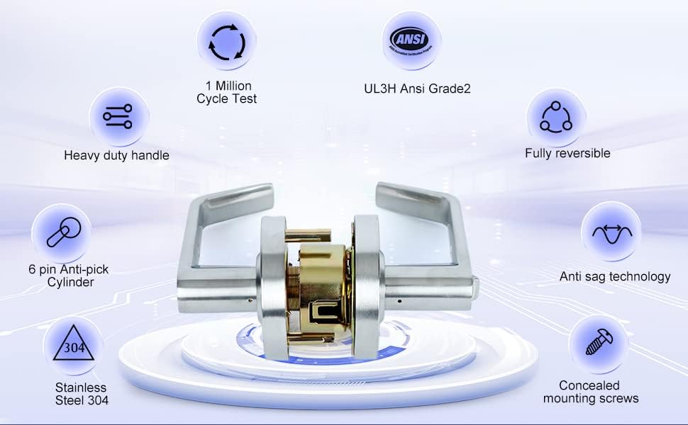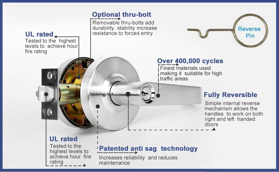 🔑CERTIFICATION: Designed to be a reliable commercial door hardware, our heavy-duty entry key locks are ANSI/BHMA A156.2 - Grade 2 (exceeds 400,000 cycles) certified and UL listed. Each lever door handle with lock is made to meet A117.10 accessible design standards. It is also fire rated for up to 3 hours. Our commercial door locks meet the needs of home/business owners, apartment managers, contractors, maintenance facility managers, handymen, locksmiths, and property managers.
