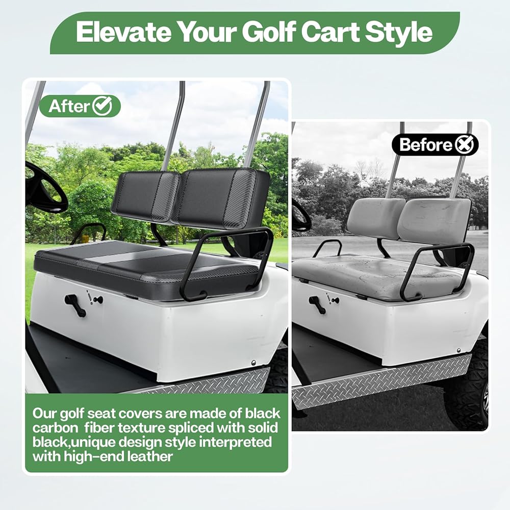 【Elevate Your Golf Cart Style】T TGBROS golf seat covers are made of black carbon fiber texture spliced with solid black, unique design style interpreted with high-end leather. Dress up your old seats a new look, give your golf cart an upscale and unique elegance, add a touch of style to your golf cart.