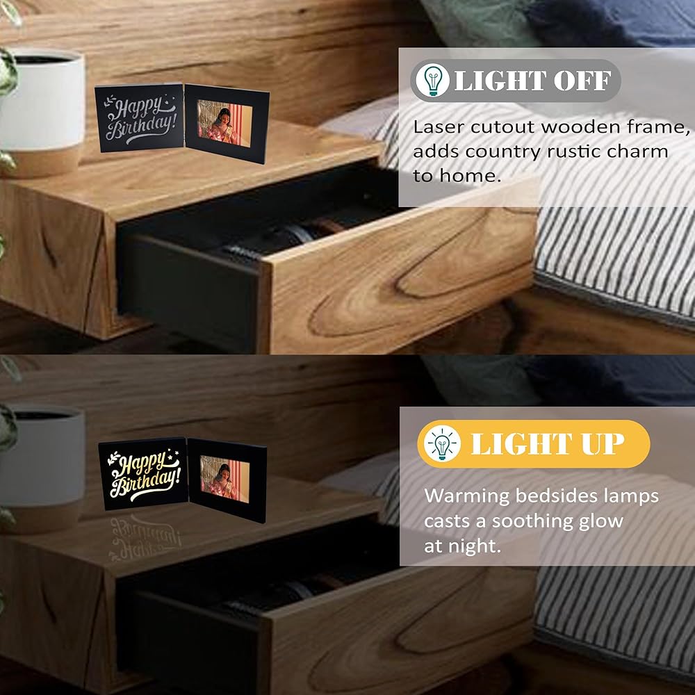 【LIGHT UP PICTURE FRAME】: Not only a simple photo frame that easily got on market, there are different warm cut out greetings and quotes including button batteries and Switch.Imagine lighting it in a dark room, on the left you see the growing of warm quotes ,the right matched theme photo, What kind of romantic mood!