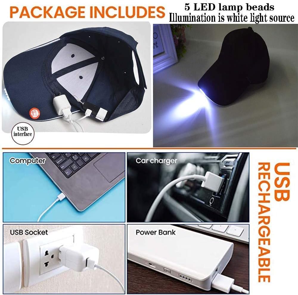 🔥The rechargeable lamp cap has a built-in 750 mAh large-capacity lithium battery (with charging cable and socket), and the service life is about 15 hours. It can be used for direct charging of the power source, and it can also be used to charge mobile phones and computer cars through the USB port of the mobile phone. It only needs 4 -5 hours, the headlight cap of the baseball cap is 5 LED lamp beads, the light source is white.