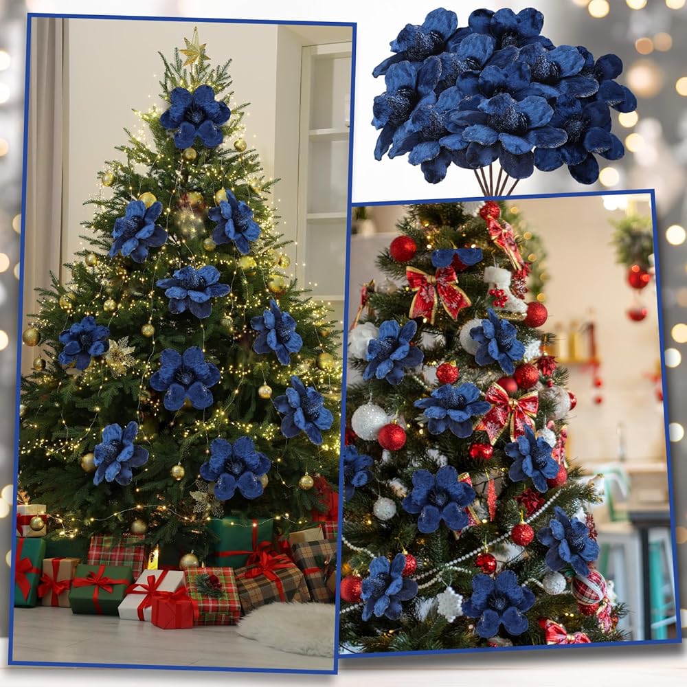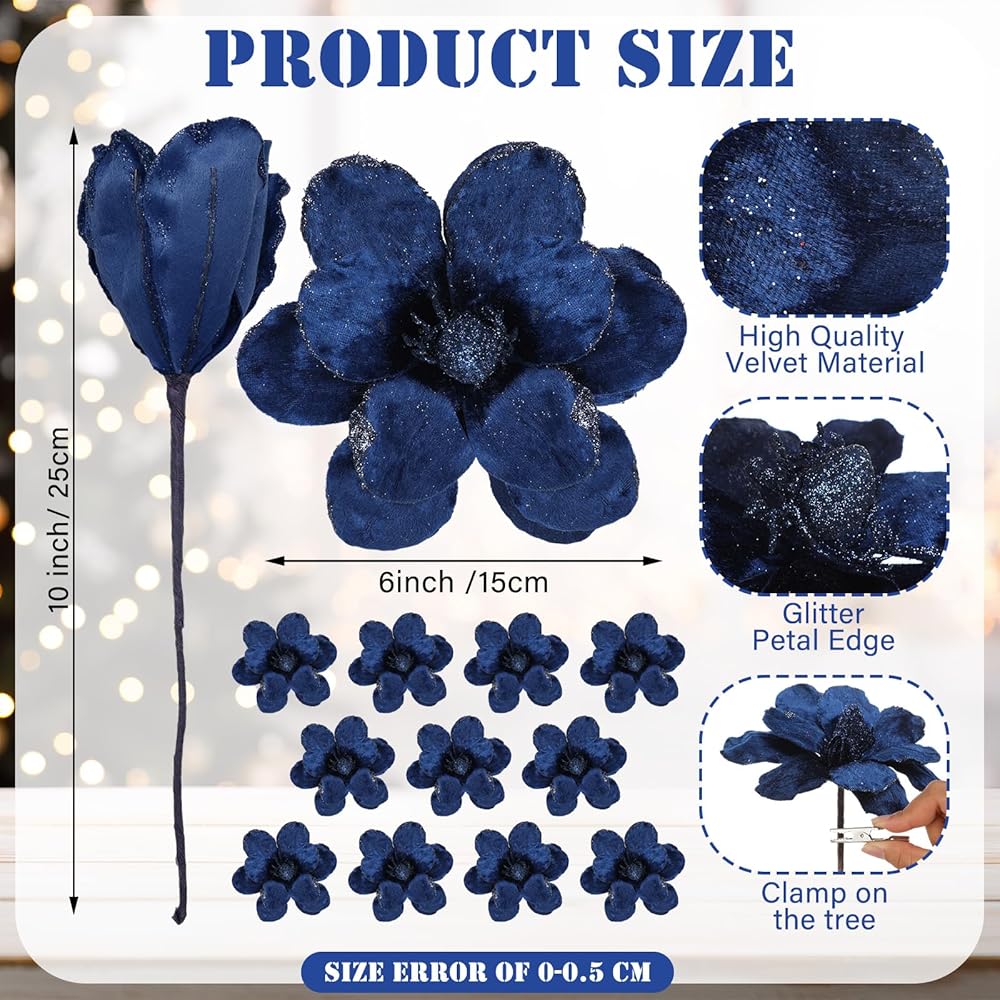 XunYee 10 Pcs Blue Velvet Christmas Glitter Flowers Magnolia Artificial Poinsettia Flower Christmas Tree Ornaments Velvet Floral Picks with Clips for Xmas DIY Wreath Decor, 6 Inch