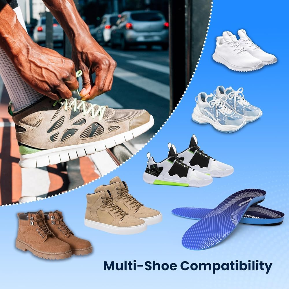 【VERSATILE DESIGN】: Constructed with moisture-wicking fabric to keep feet dry, reduce odor, and ensure freshness all day long Our best all-day standing insole is engineered to fit seamlessly in both casual and athletic shoes. Whether you run, work, walk or participate in a variety of sports, our professional running insoles provide comprehensive support and unparalleled comfort so you can stay energized and spend more time doing the activities you love.
